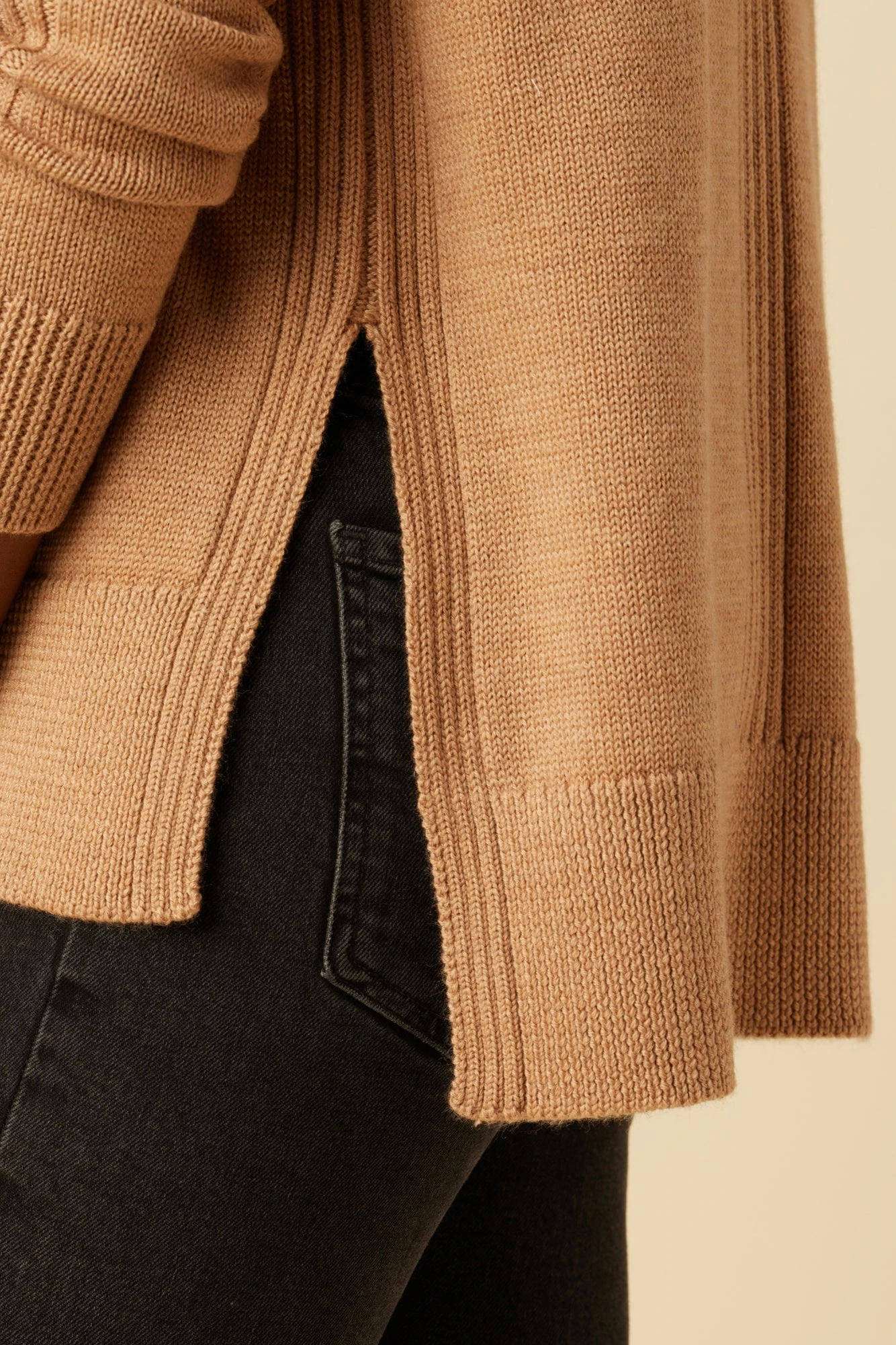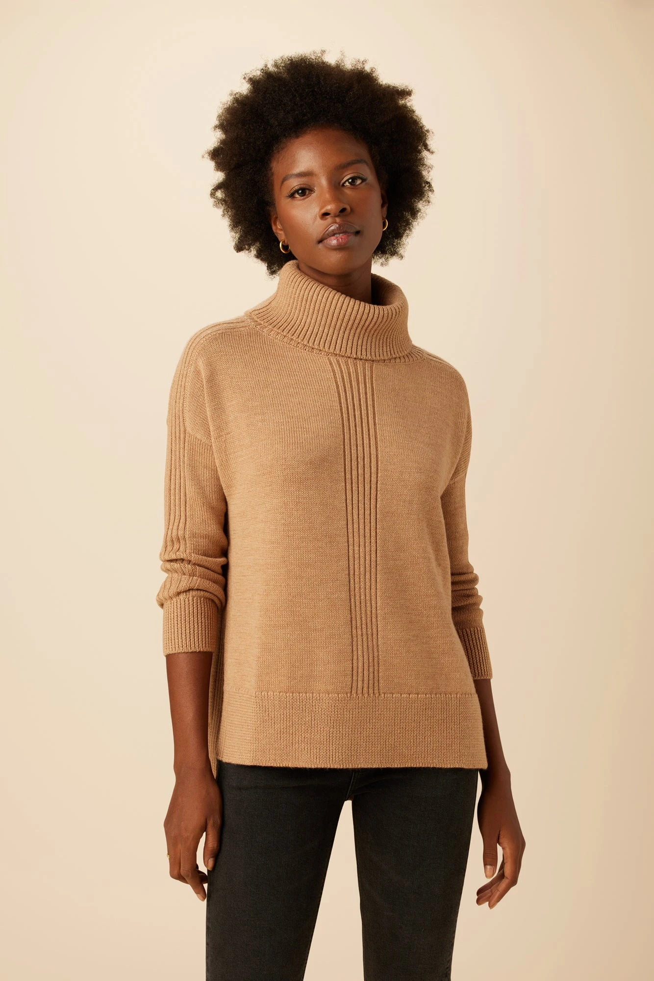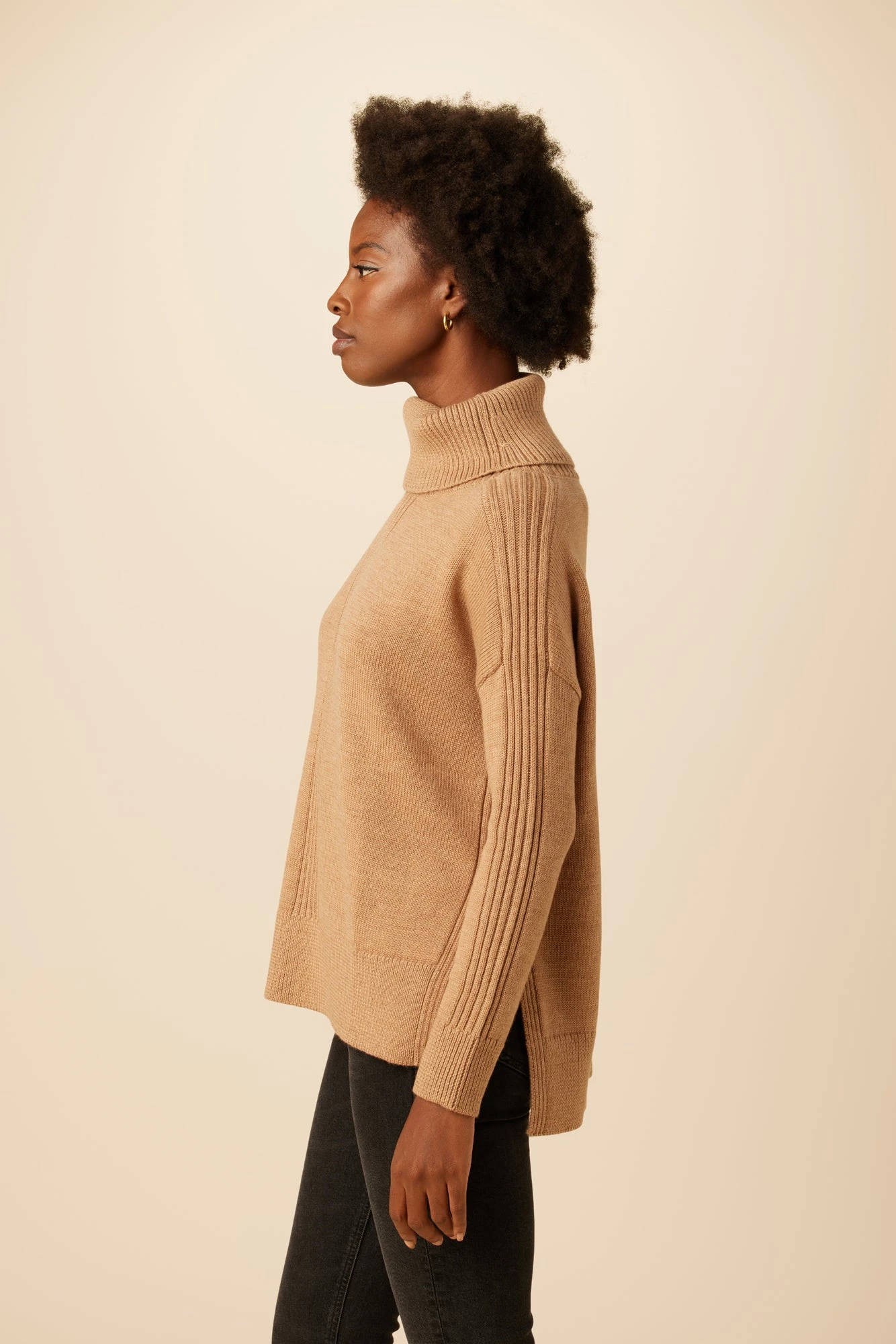 Slouchy turtleneck sweater with a loose body and side slits. We use only harm-free and non-mulesed wool to create our sustainable, fully biodegradable sweaters.