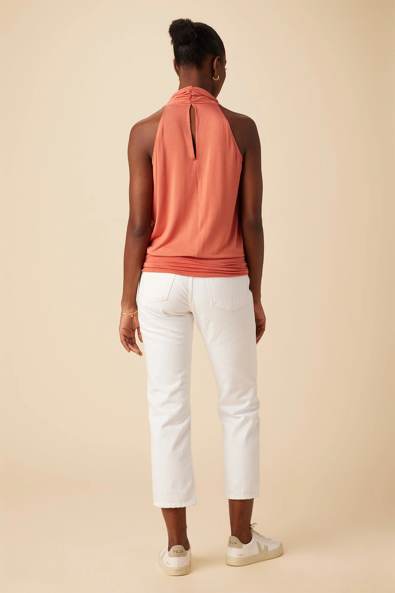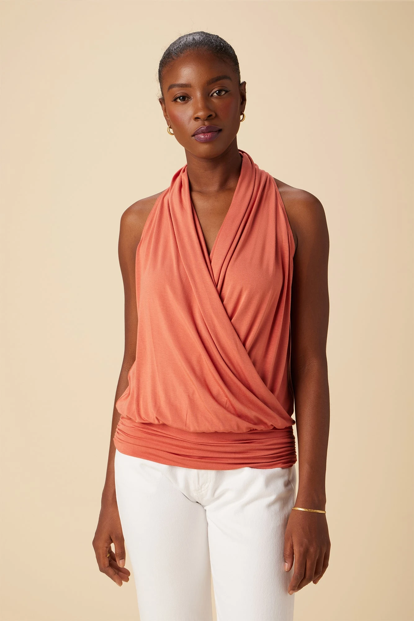 - Surplice wrap halter tank with a keyhole opening in back and a thick bottom band with shirring detail at the sides.