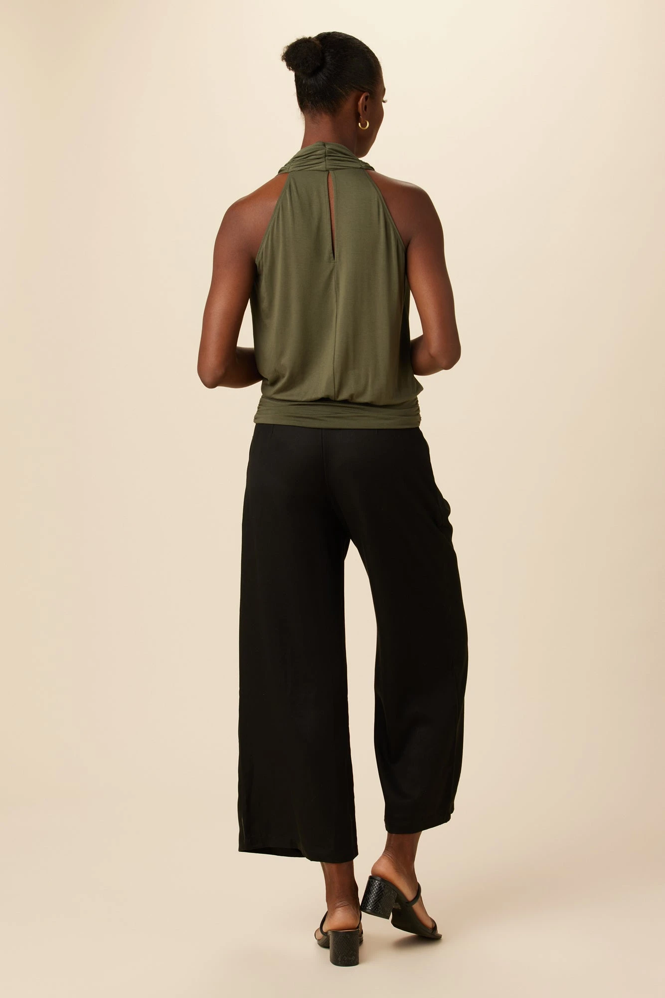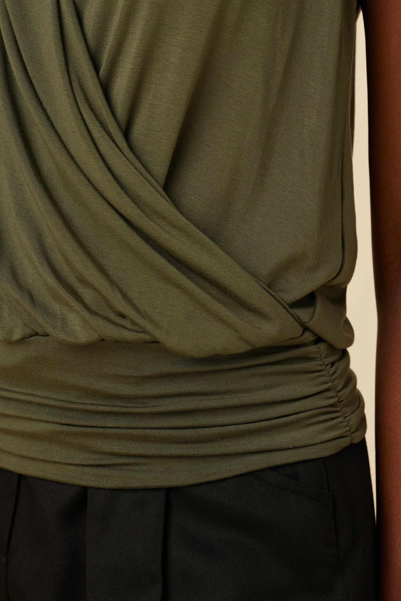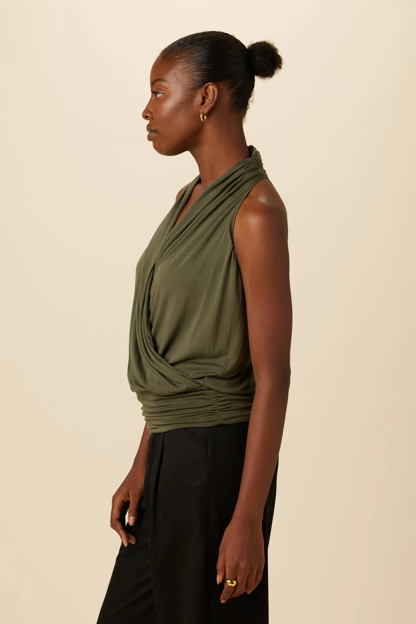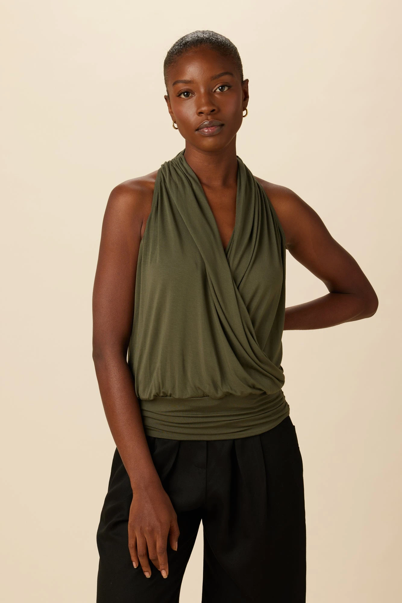Surplice wrap halter tank with a keyhole opening in back and a thick bottom band with shirring detail at the sides. Our softest signature Dream Knit creates a top so comfortable, you’ll want to wear it with everything.