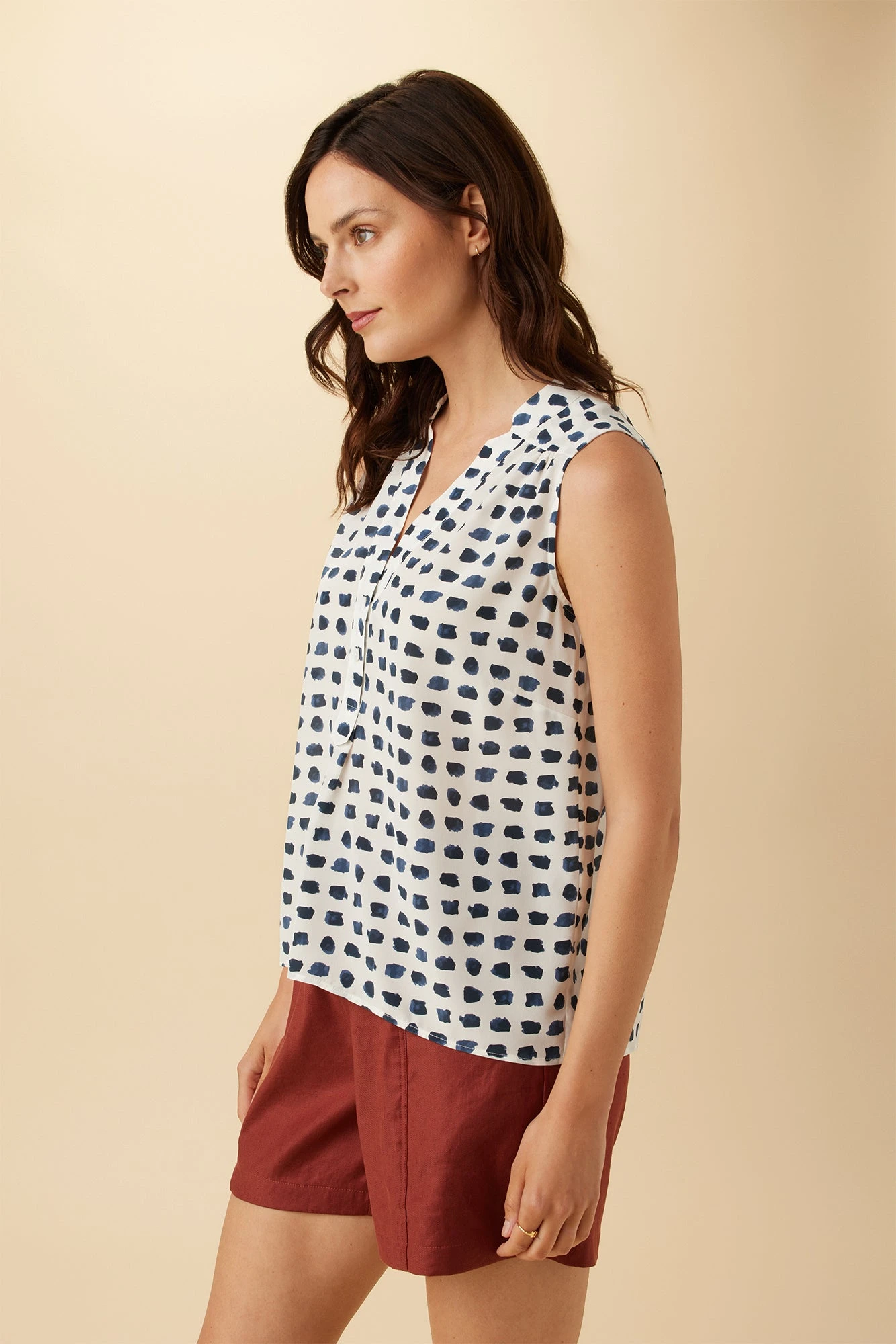 - This sleeveless blouse features a notched collar, loose body, and two center front buttons.