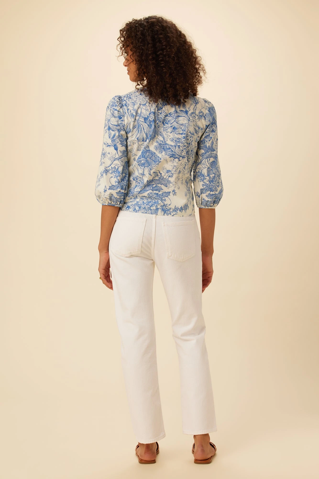 3/4 puff sleeve blouse with built-in tie, v-neckline, made from our Organic Cotton fabric. We suggest pairing this cropped style with our Mariah Skirt for a matching co-ord, or your favorite high-waisted denim.
