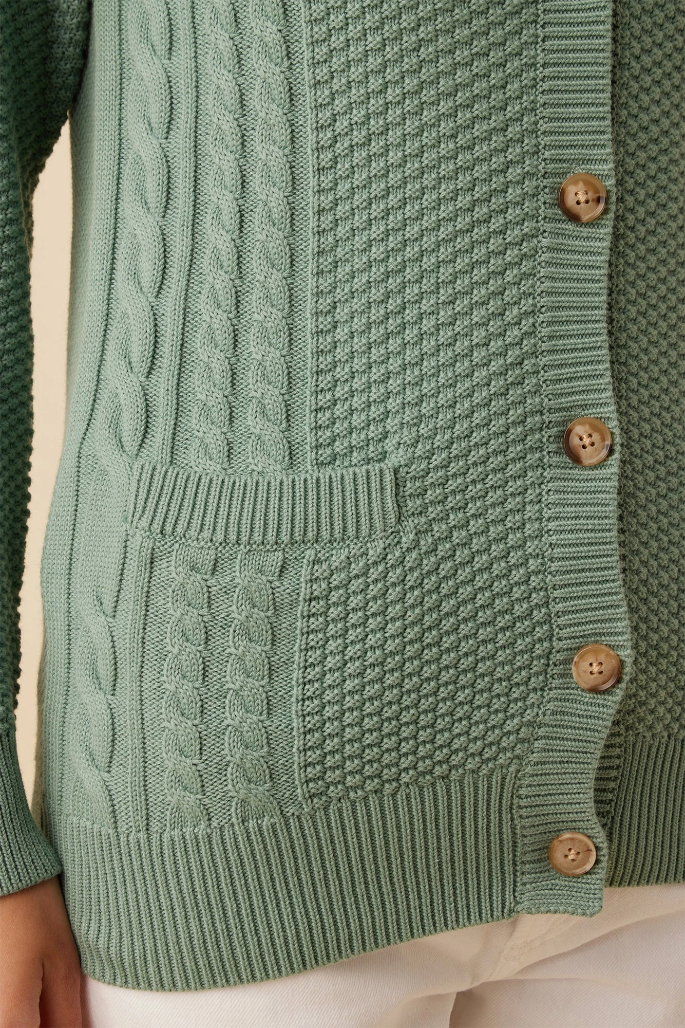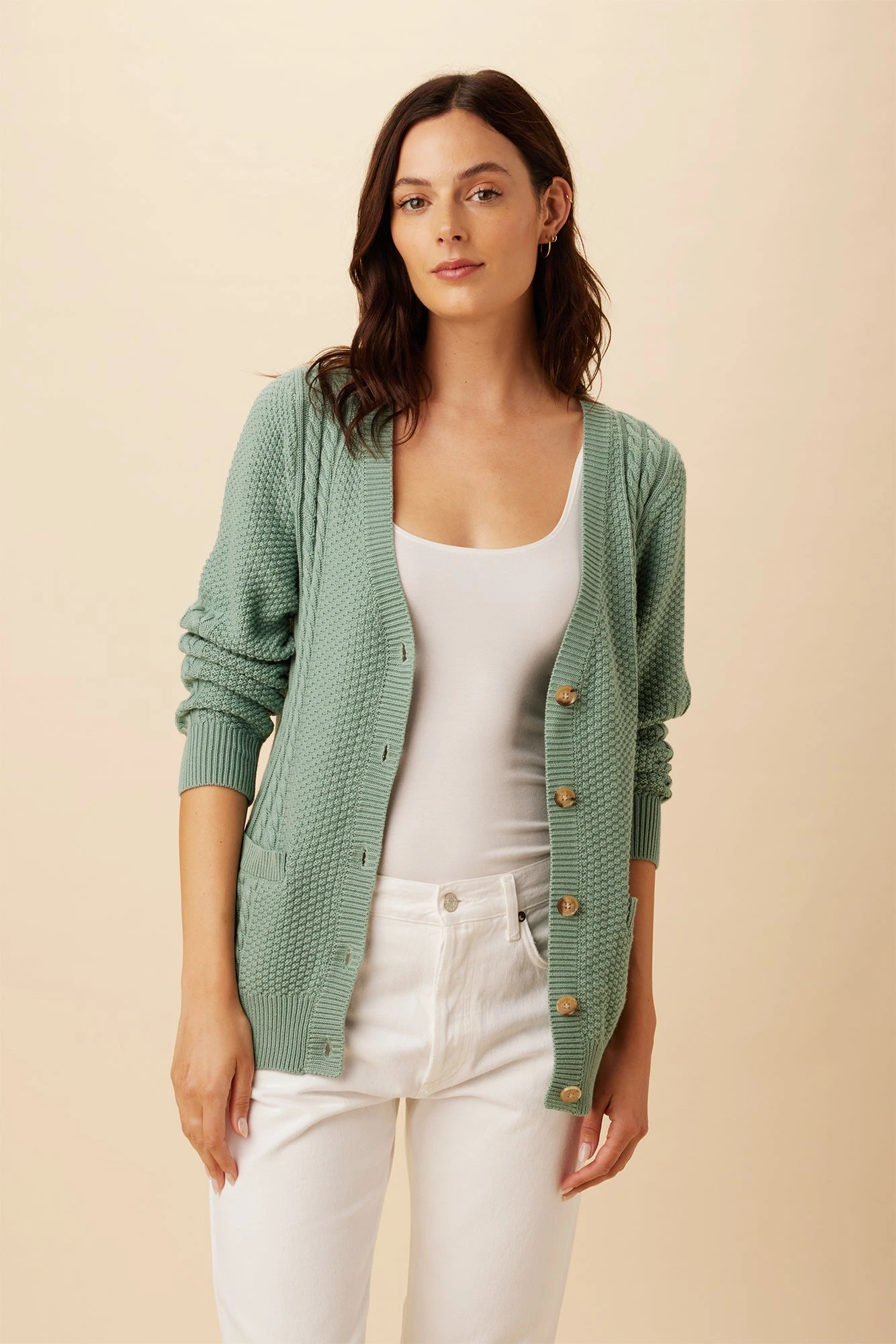 - Long sleeve v-neck cardigan featuring classic cable knit stitch and urea buttons.