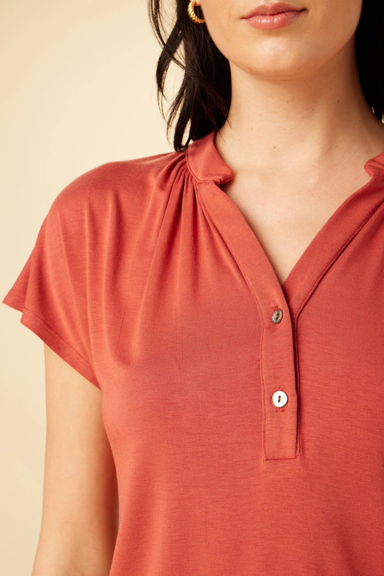 This style features our signature soft tailoring details with a v-neck opening, two-button closure, short sleeves, and an overall relaxed fit. We recommend pairing with mid-rise bottoms.
