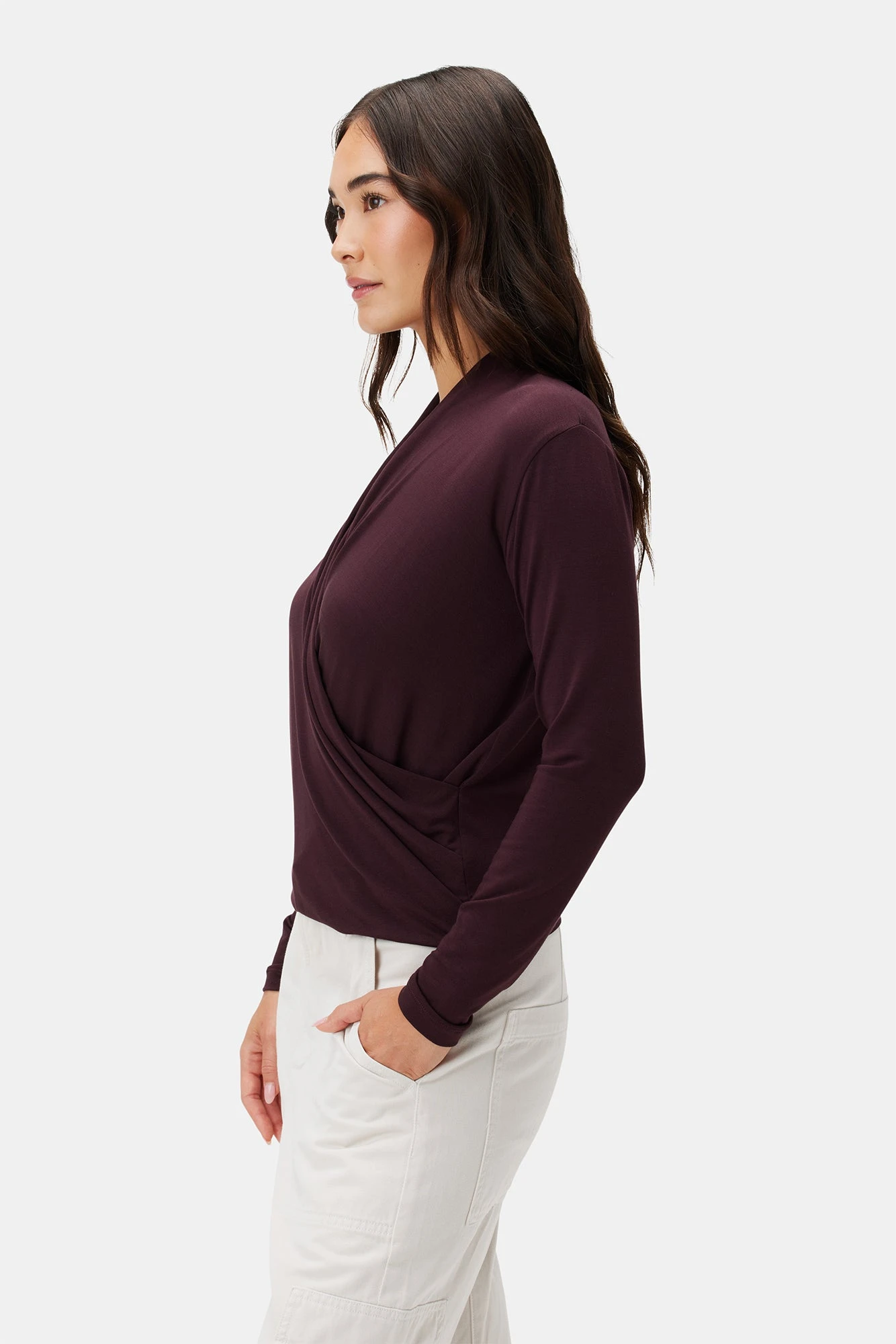 - Long sleeve blouse featuring fixed surplice neck line, pleat details at side seam and yoke with pleat at back.