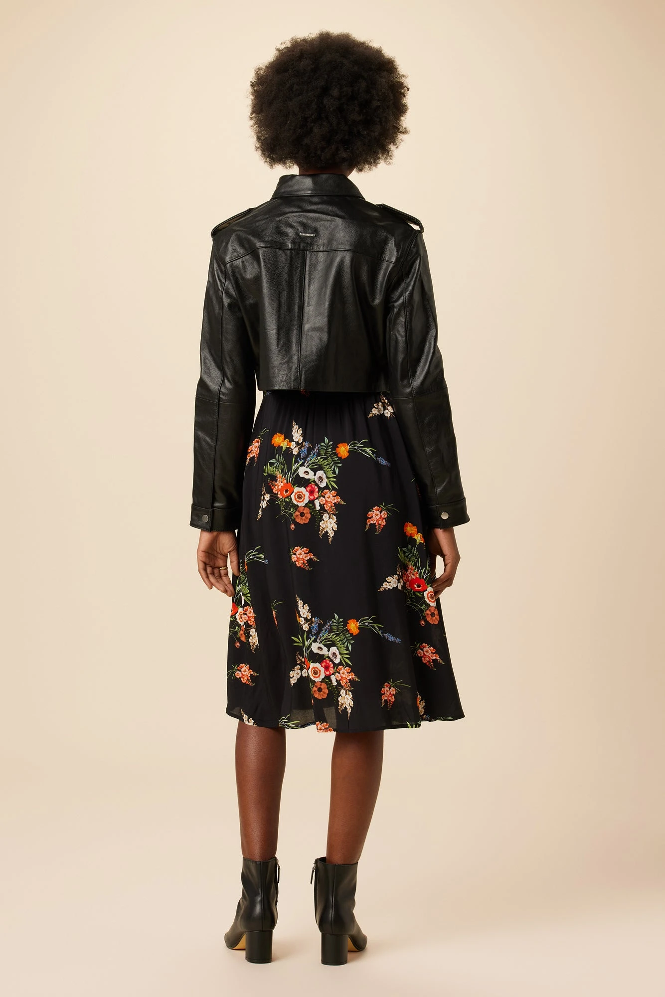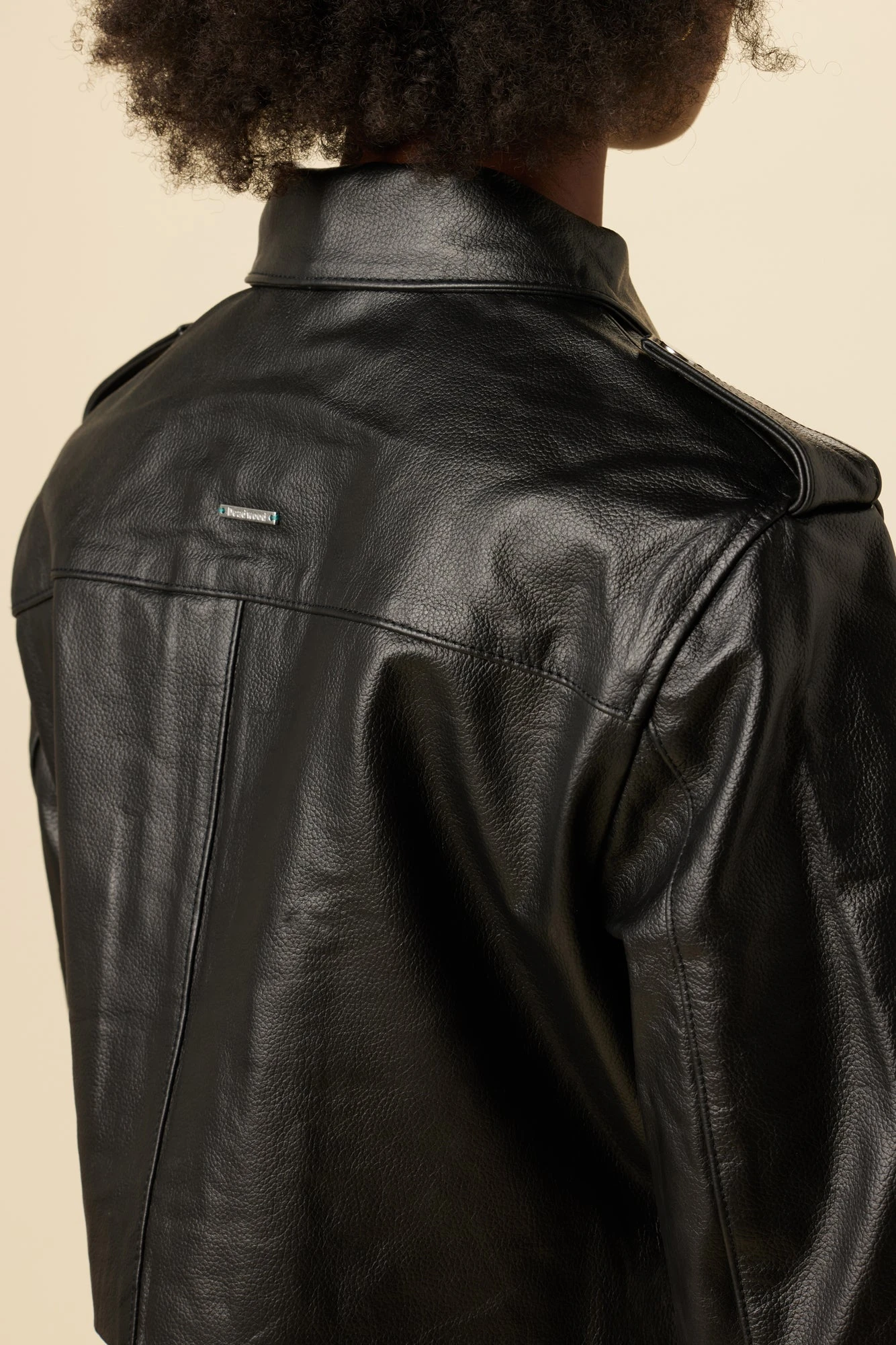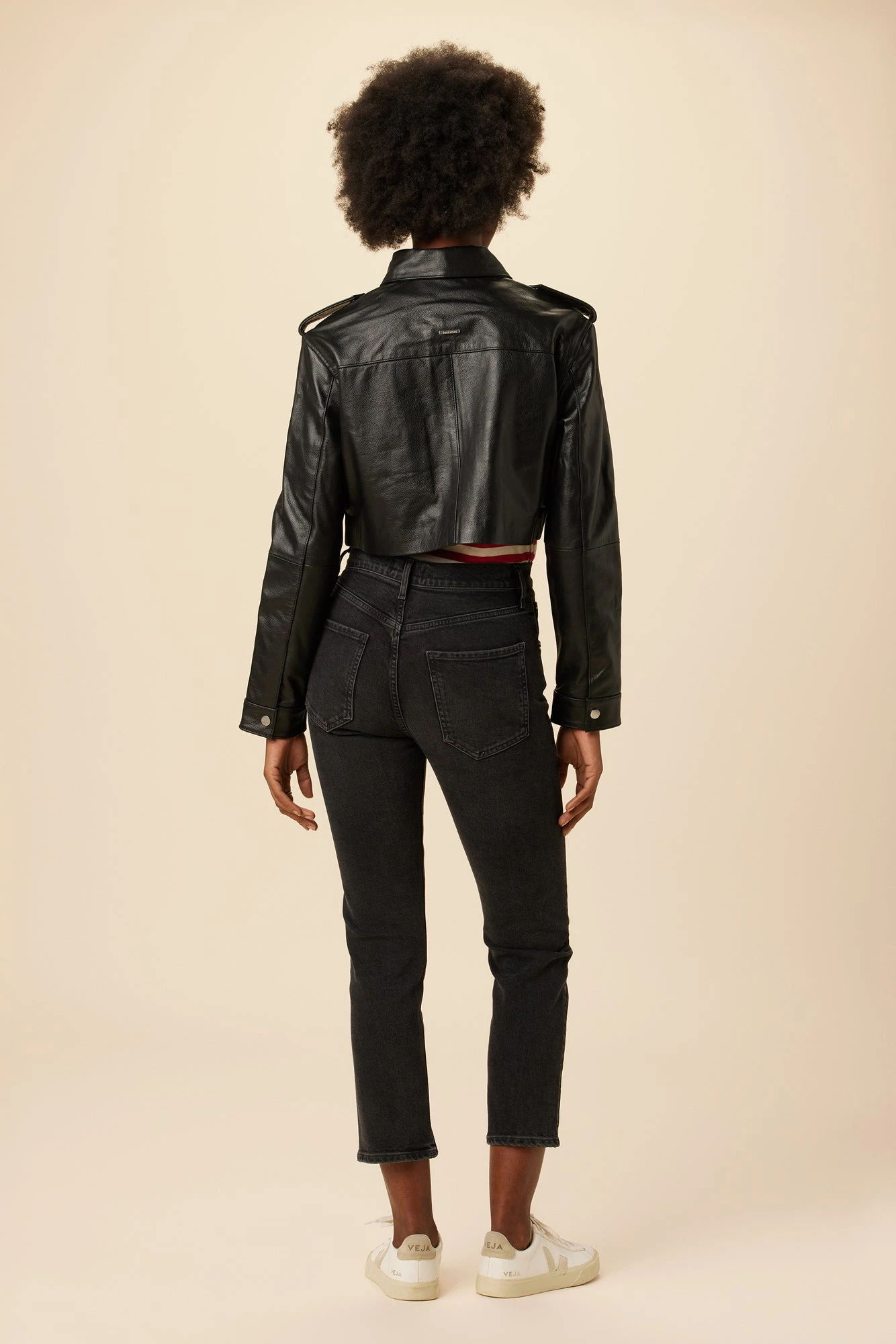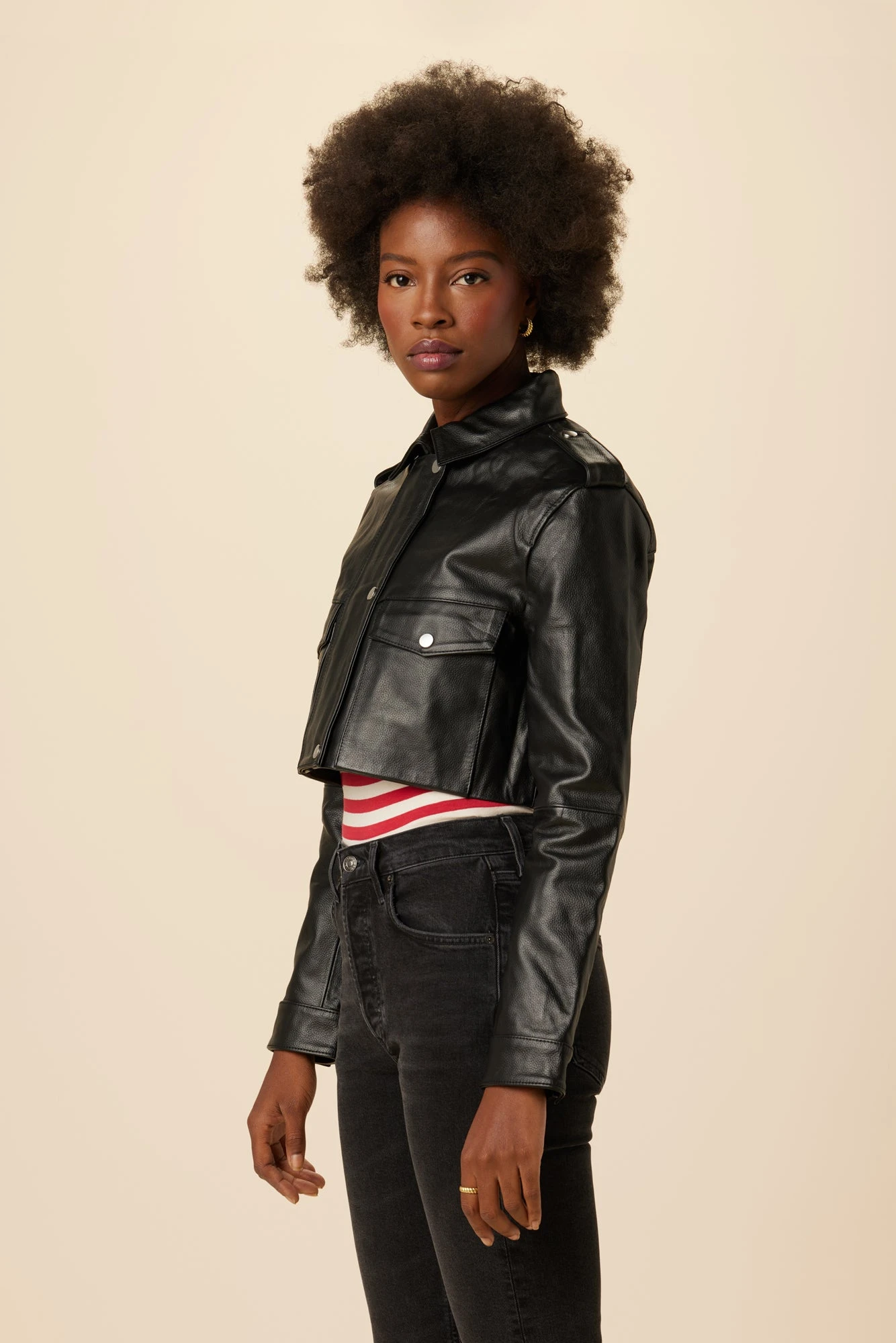 Army cut cropped leather jacket with shoulder epaulets, duo chest pockets, and center front closure with both zipper and buttons.