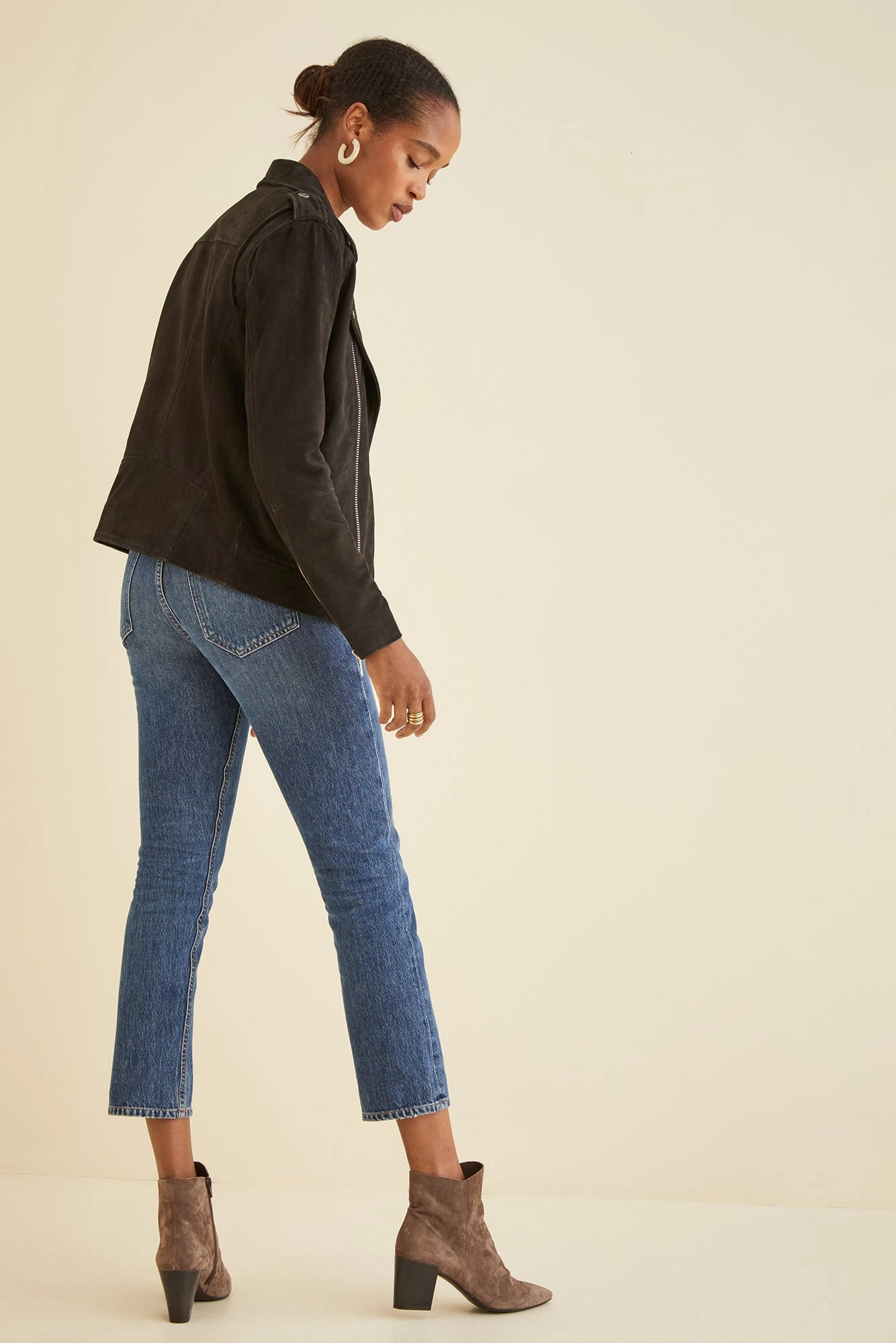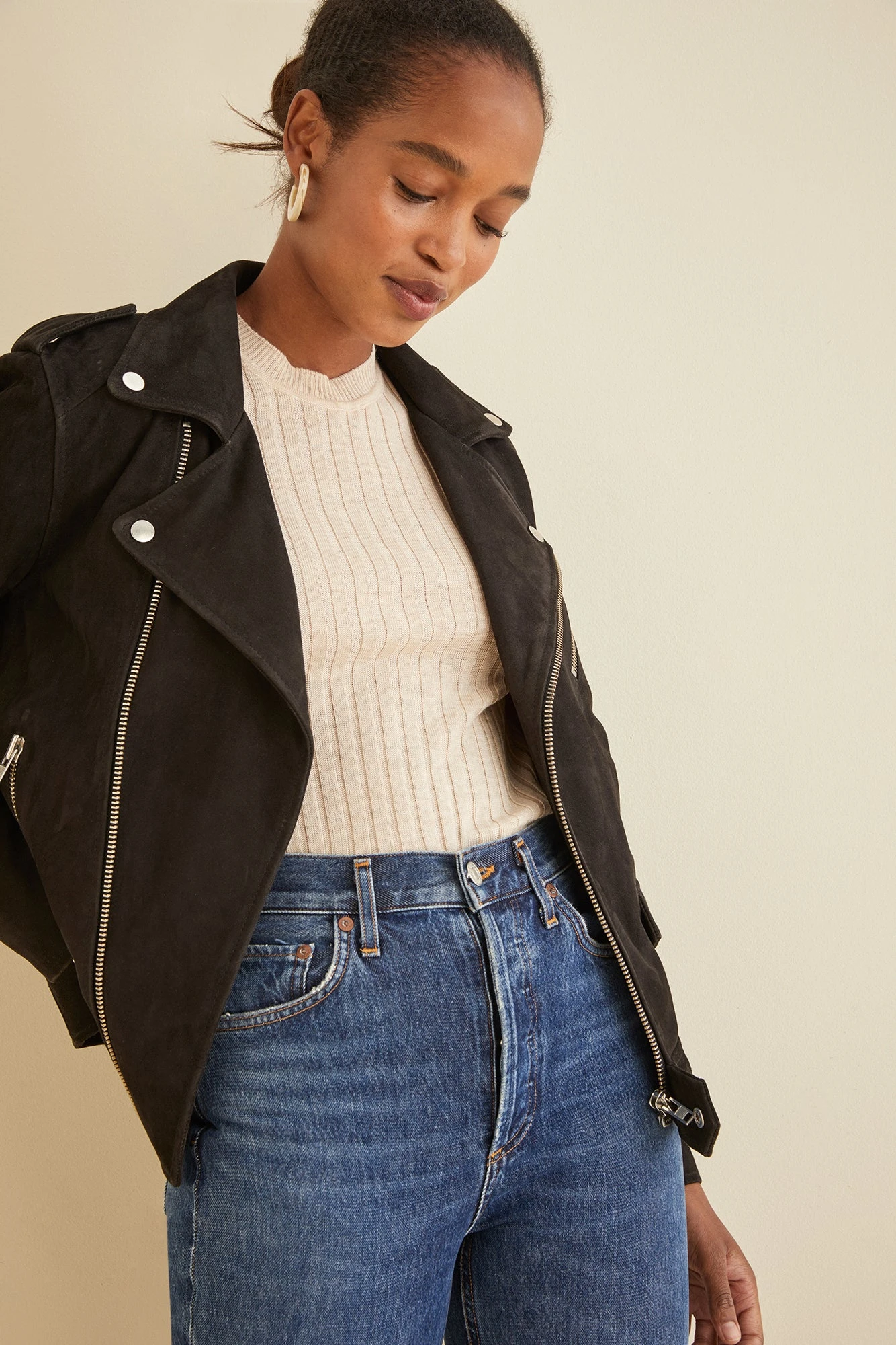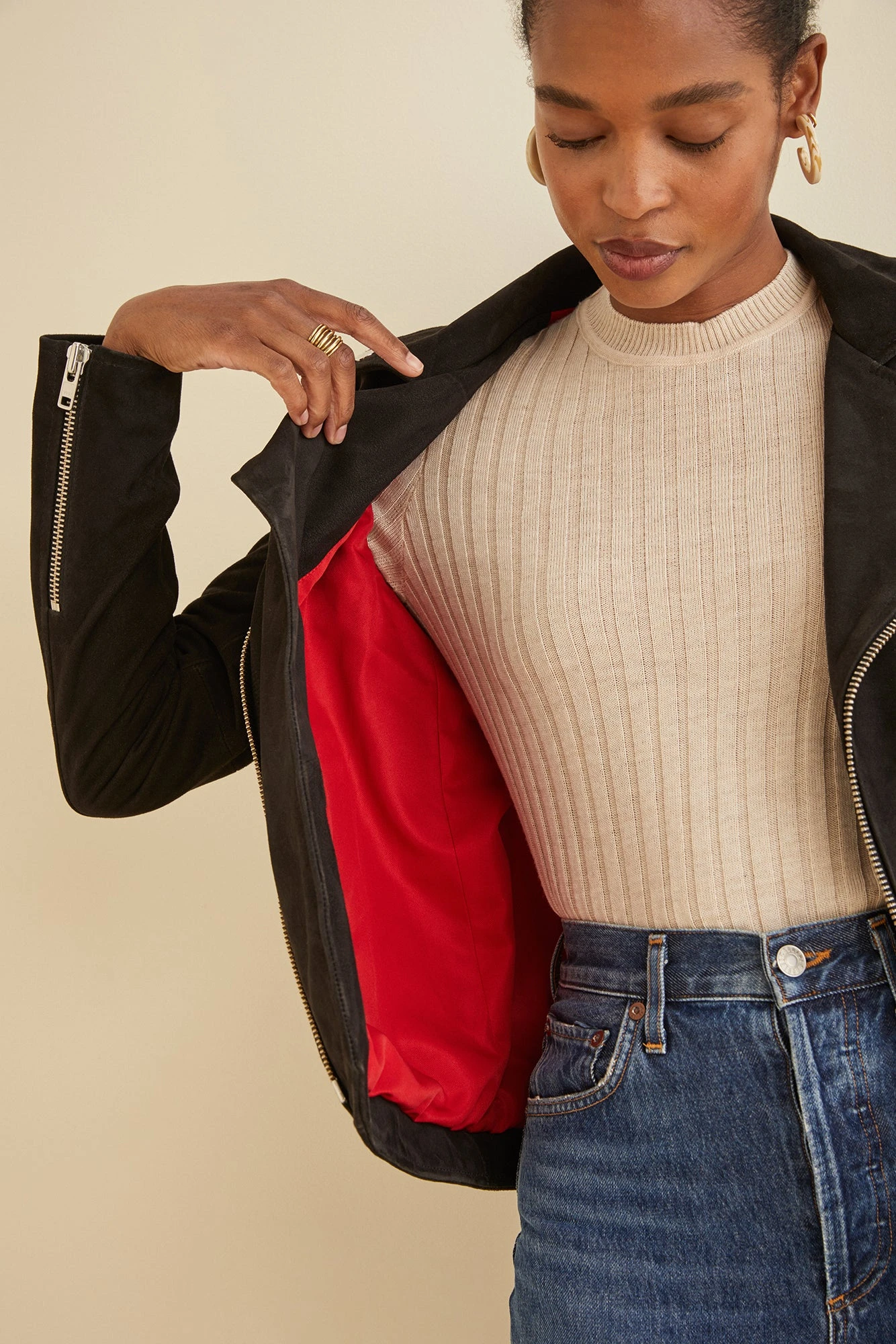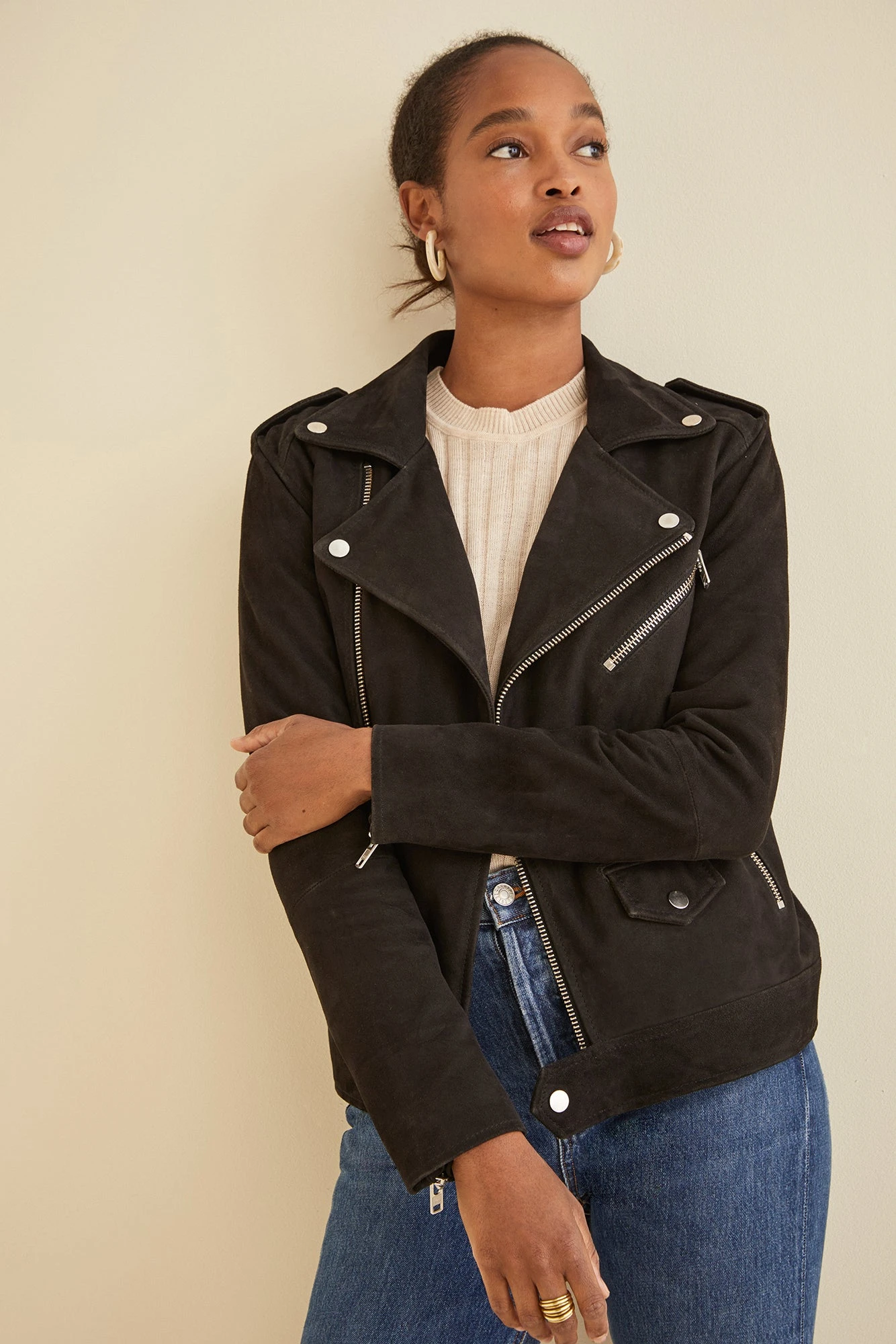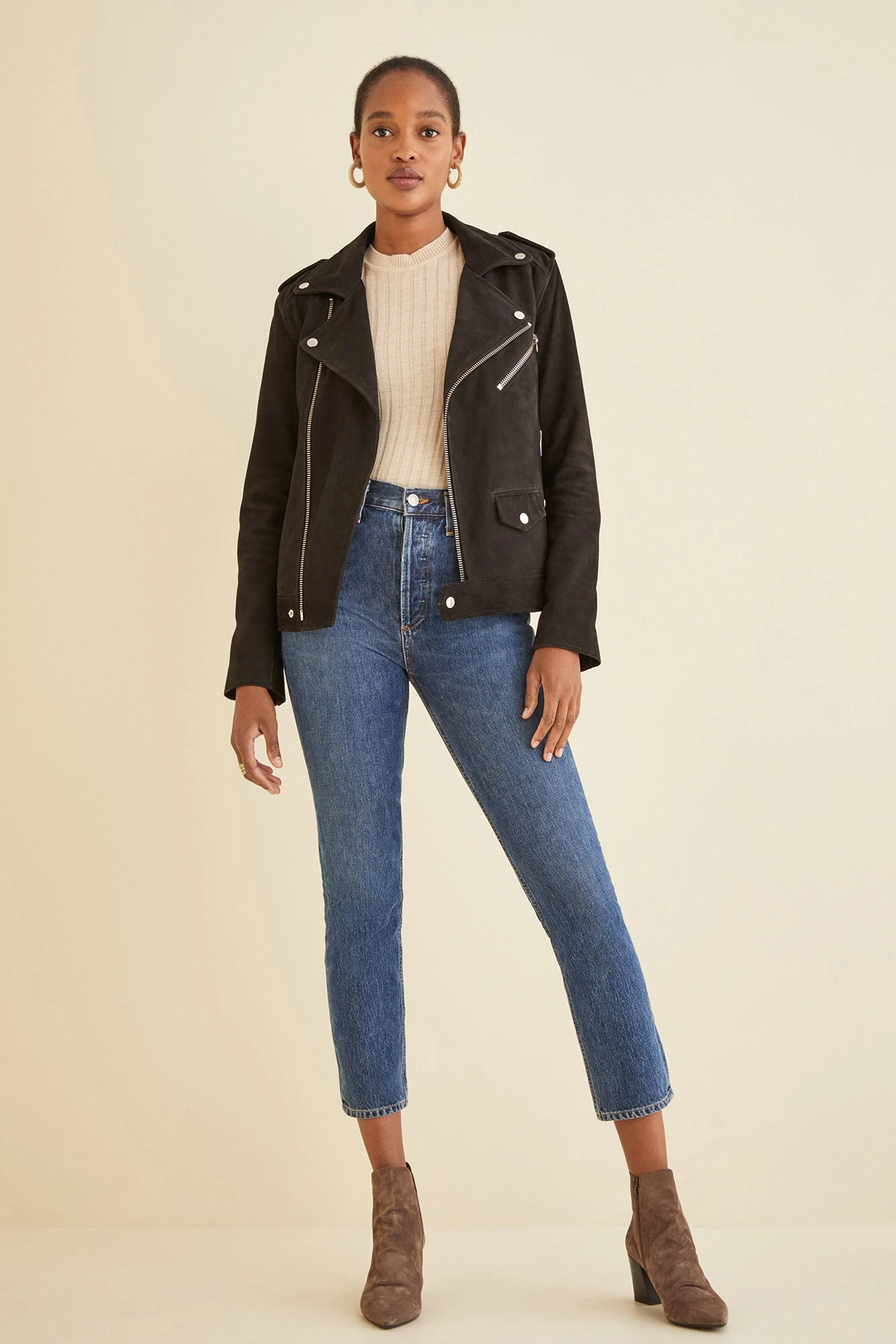 Classic black suede biker jacket featuring a slanted zipper and three zip pockets in front, a strap with buttons at the hem, and zip cuffs.