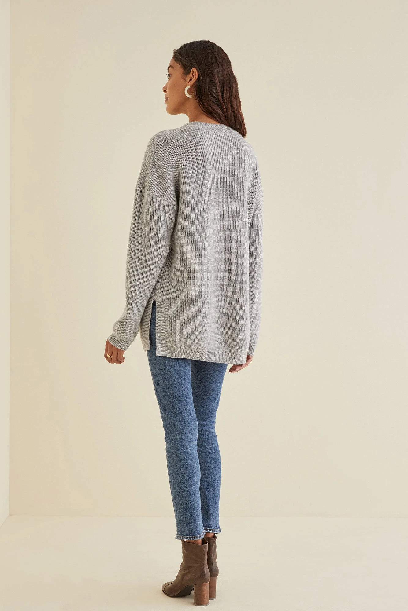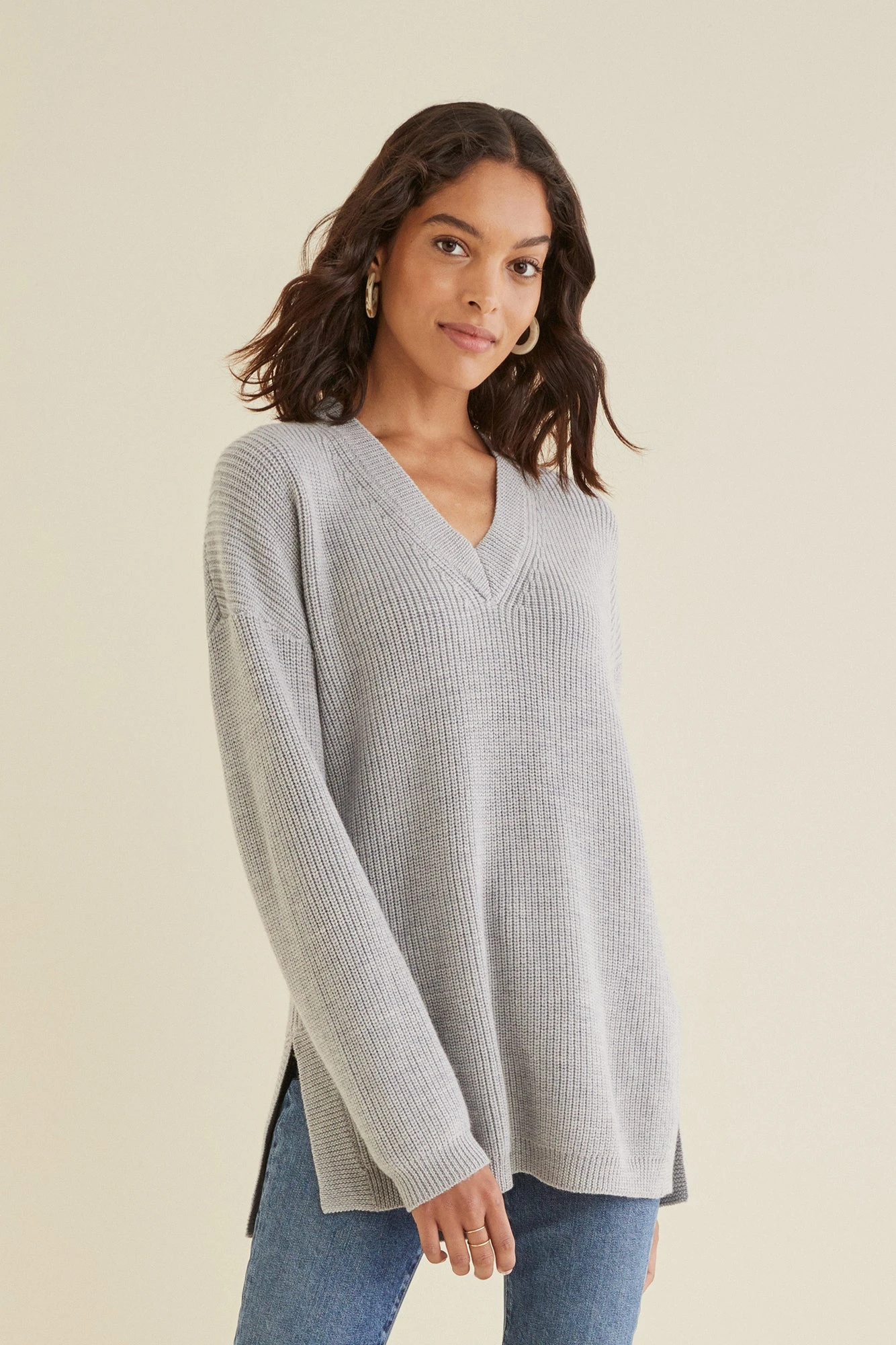 Cozy, oversized v-neck sweater with side slit detailing. An easy throw-on-and-go layer that pairs effortlessly with your favorite denim.Â