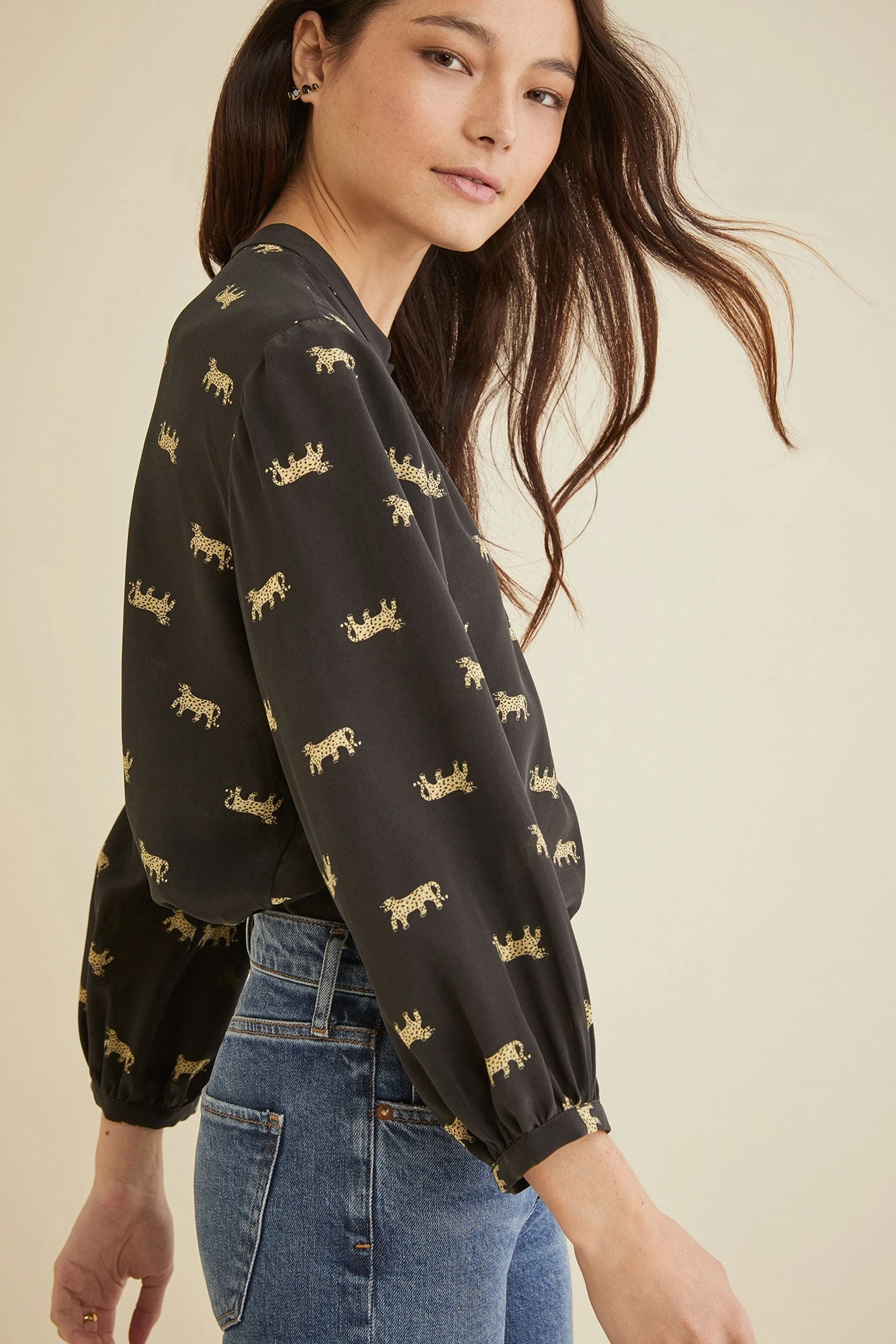 Mock neck blouse with gathering in front, 3/4 length voluminous sleeves with bracelet cuffs, and a keyhole opening in back.