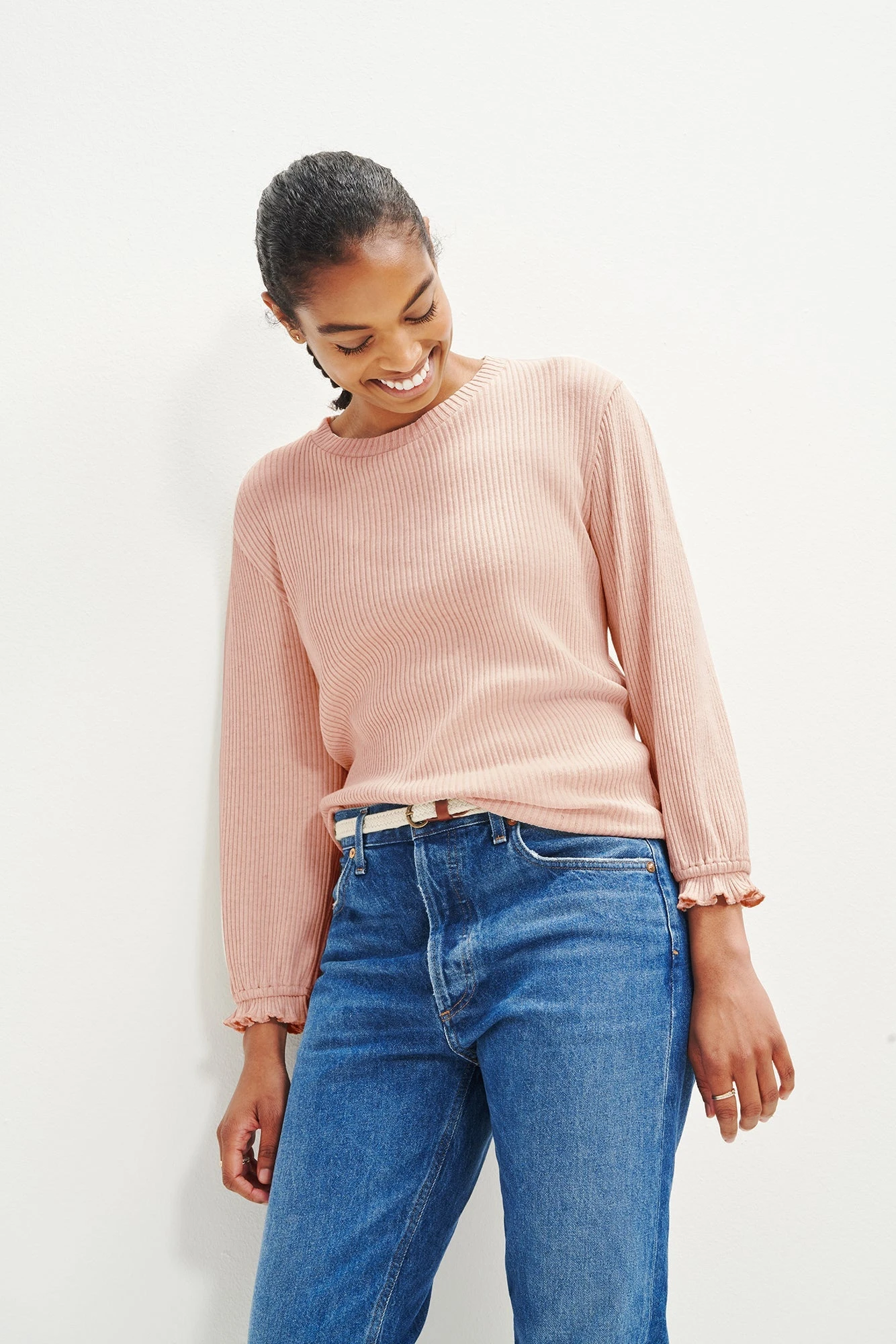 Lightweight ribbed sweatshirt with a crewneck and ruffle detailing at the cuffs. Made in our signature Paris Rib, a soft and stretchy ribbed fabric made of beechwood tree fibers.