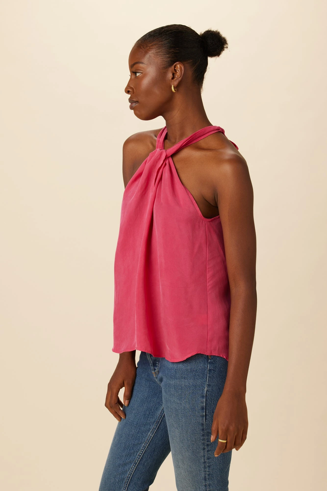 Relaxed fit, halter neck blouse with tie through keyhole, made in our luxurious Washable Silk. This top pairs well with any rise bottoms, tucked in or over top.