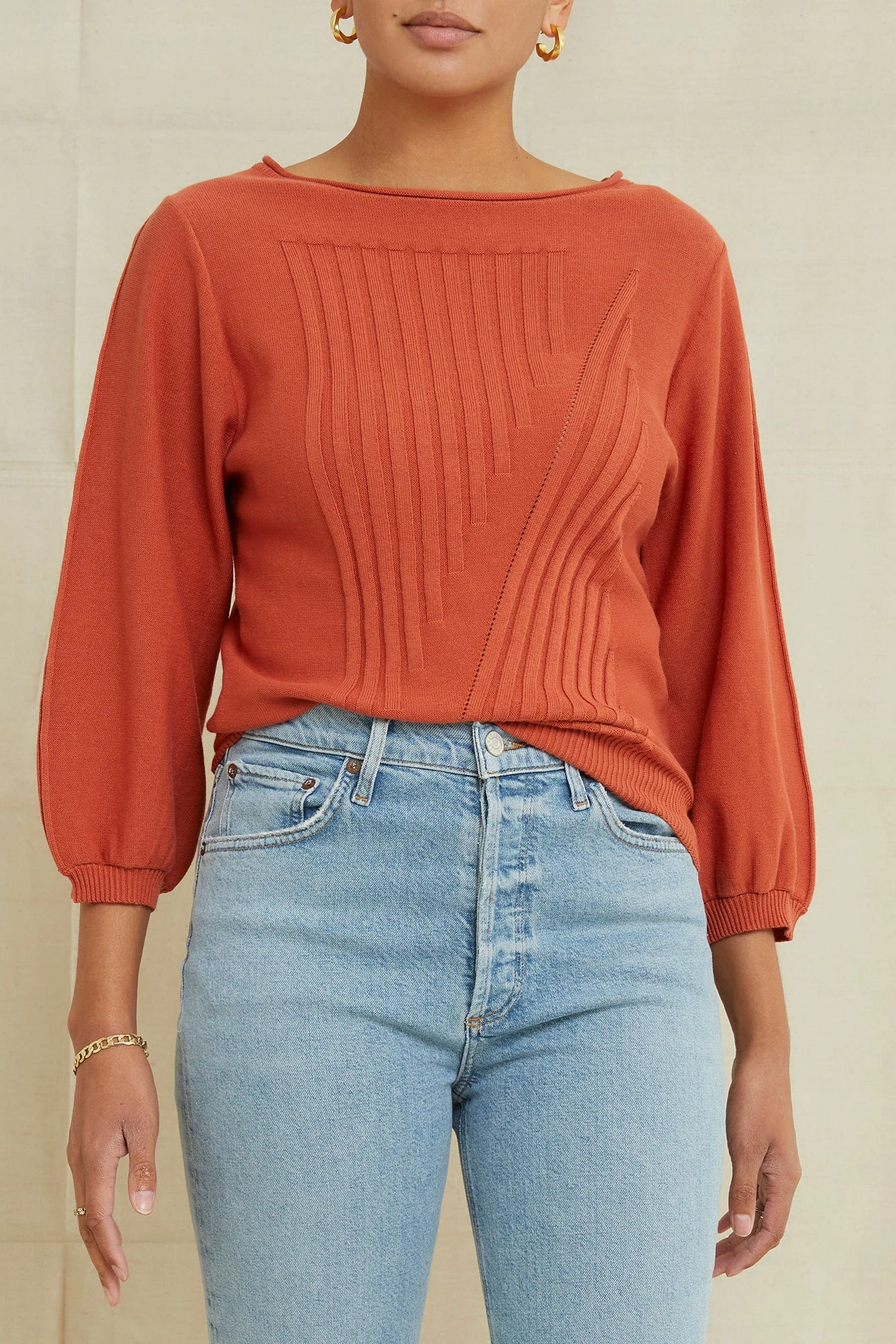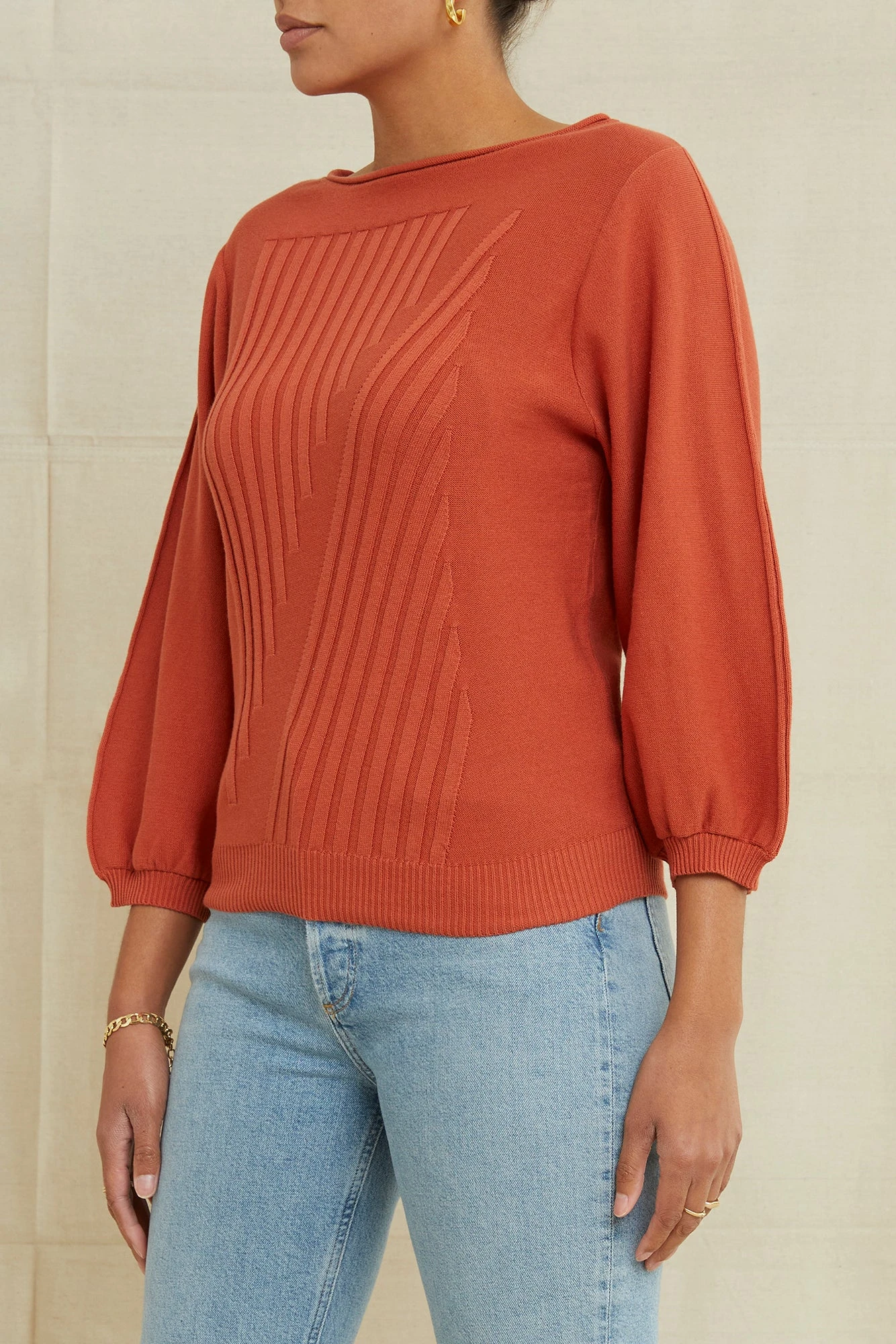 3/4 sleeve sweater with voluminous puff sleeves and geometric stitching at the front. Made from our soft and lightweight organic cotton, perfect for layering.
