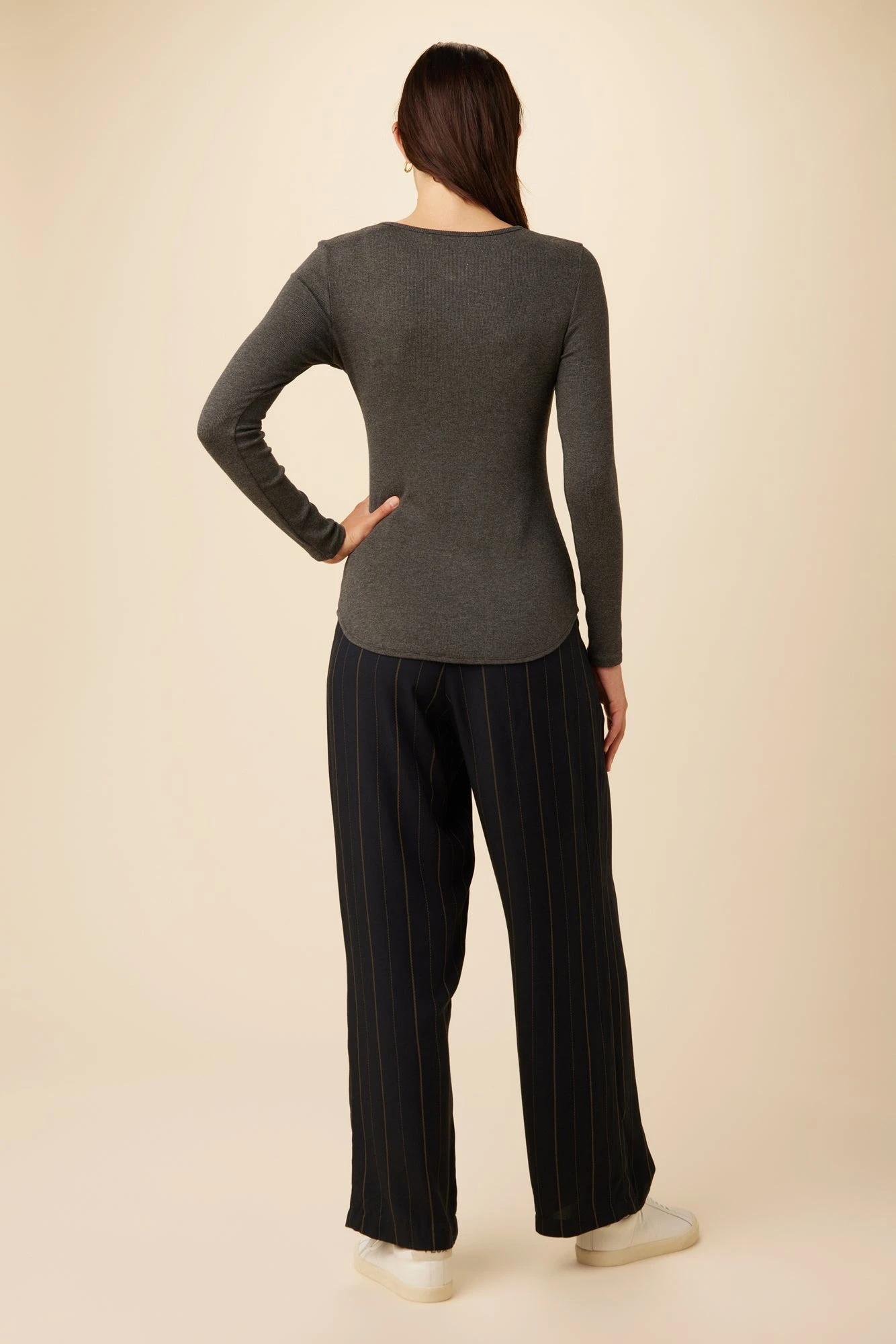 - Long sleeve tee with an open neck and shirt-tail hem.