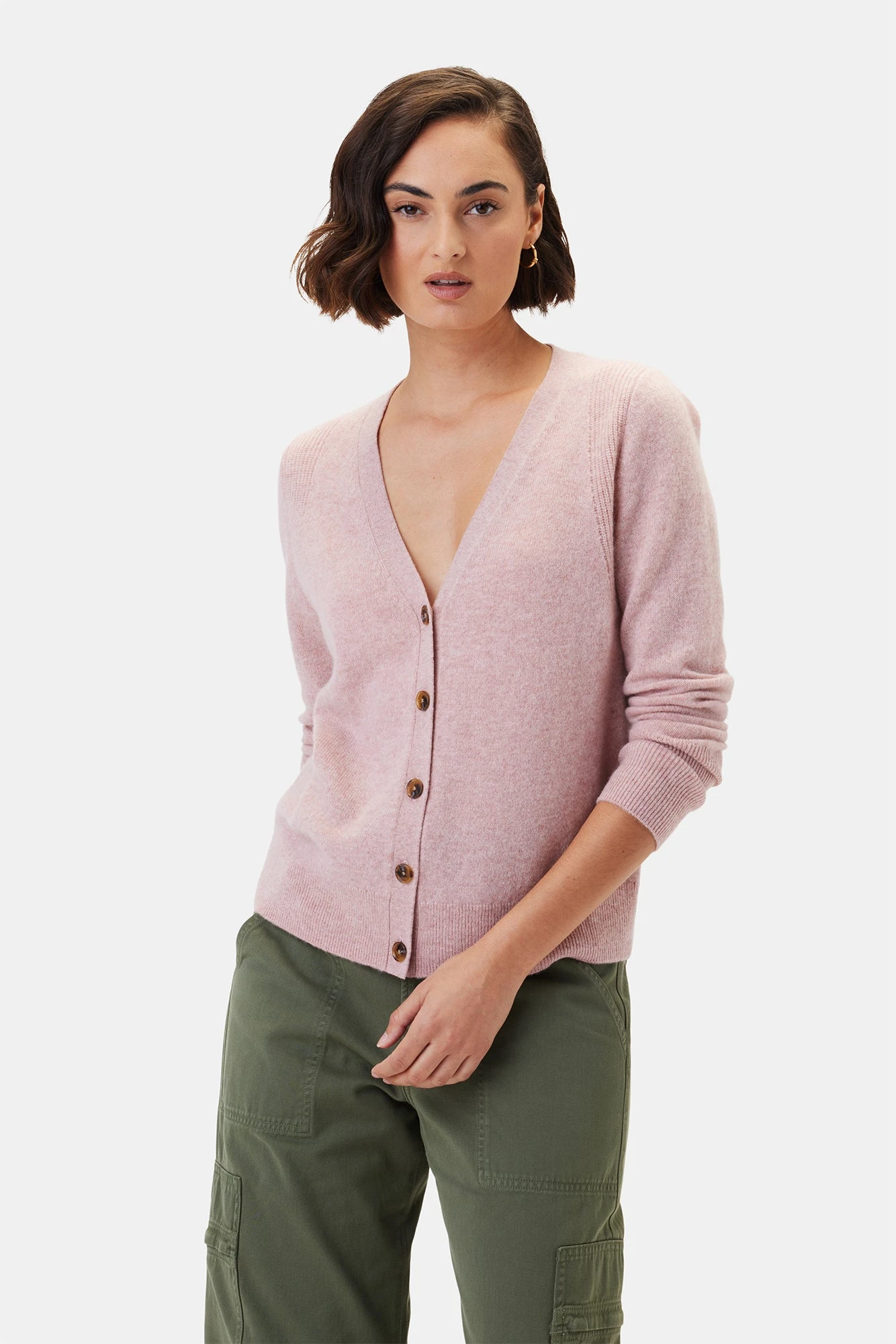 - Mid gauge cashmere cardigan featuring long sleeve, v-neck with button front, and rib stitch detail around the shoulders.