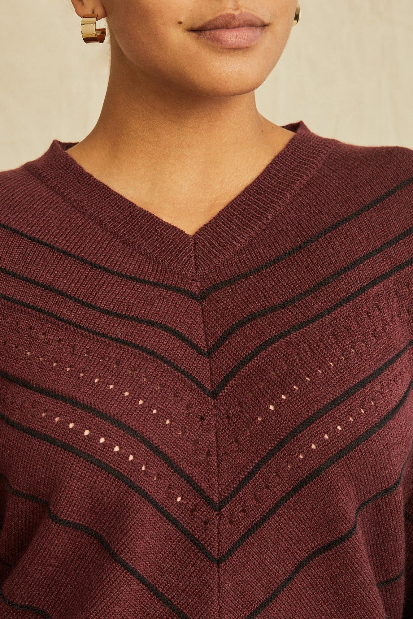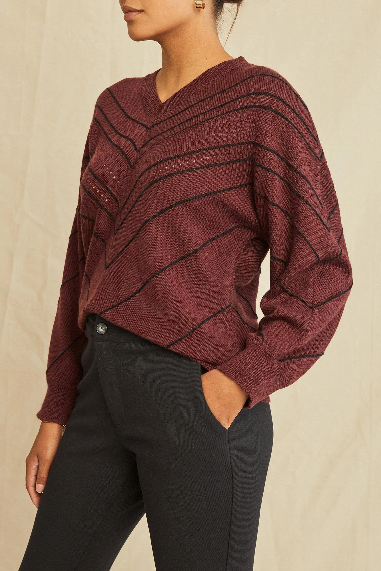 V-neck pullover sweater with chevron multi-colored stitching details. Made from our harm-free and fully biodegradable Merino wool.