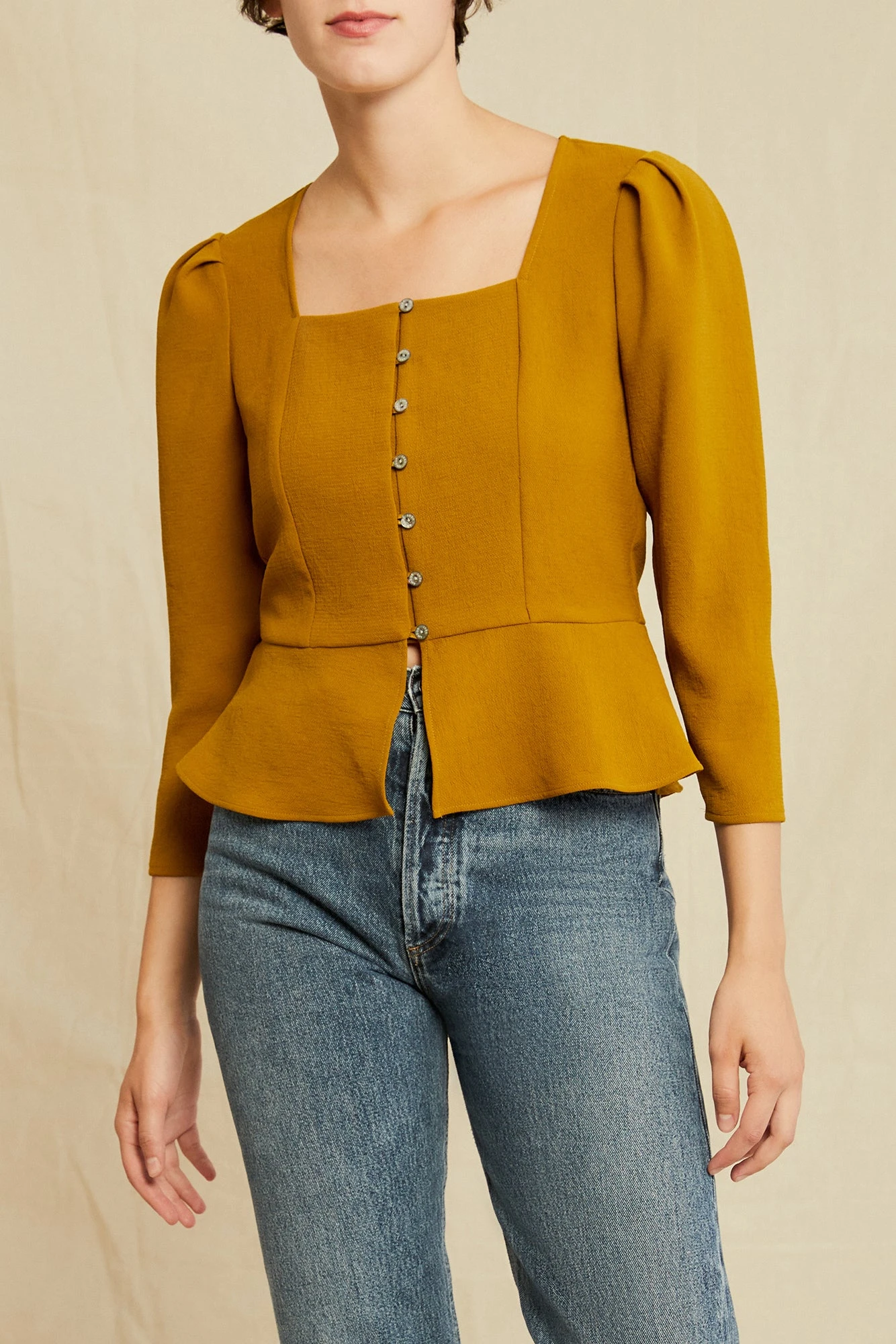 - Fitted style with square neck buttons and loops at center front and peplum at hem