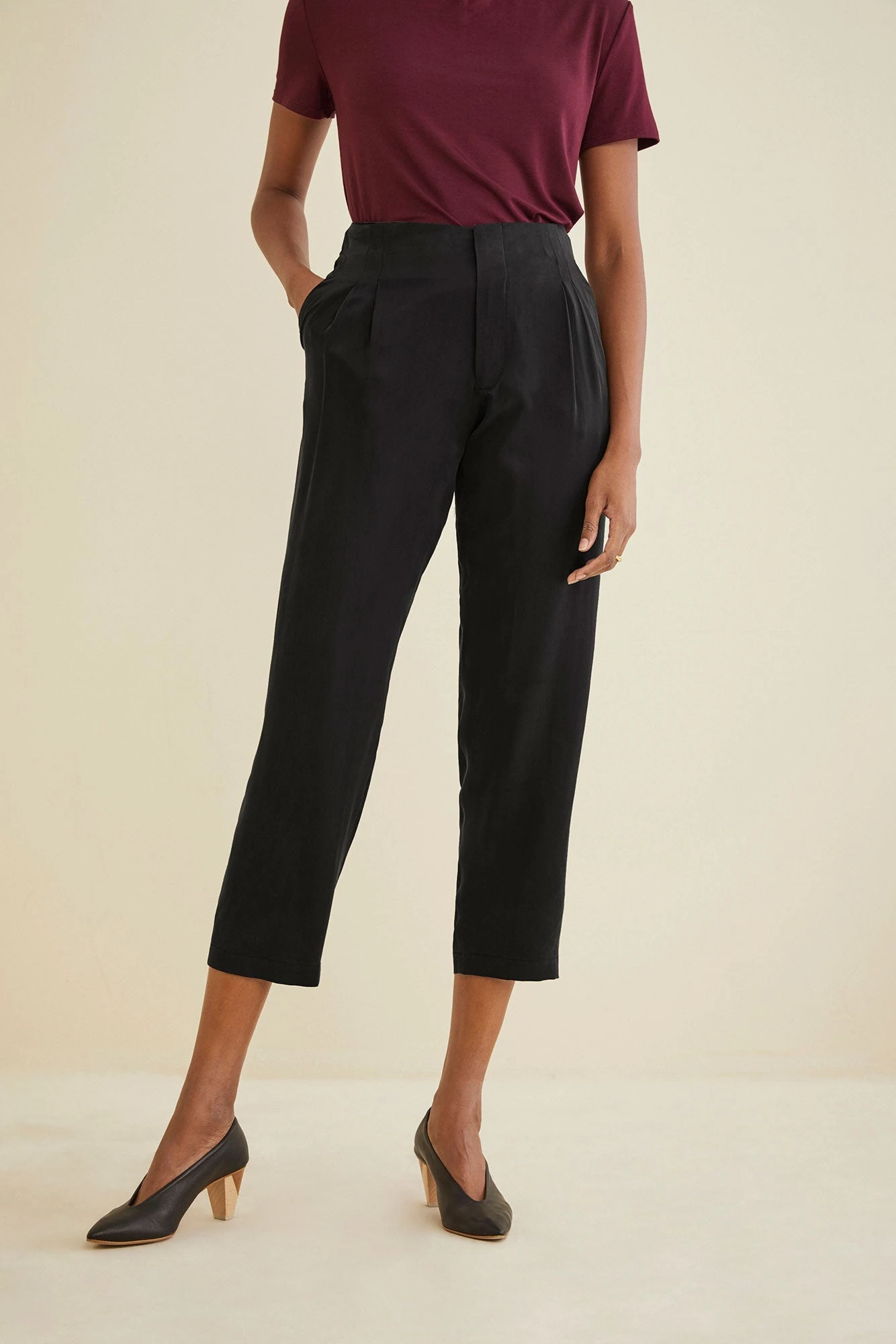 High waisted, straight-leg pants with a front zipper, internal button, and hook and eye closure. Made from our luxurious silk charmeuse, these pants are sure to elevate any outfit.Â