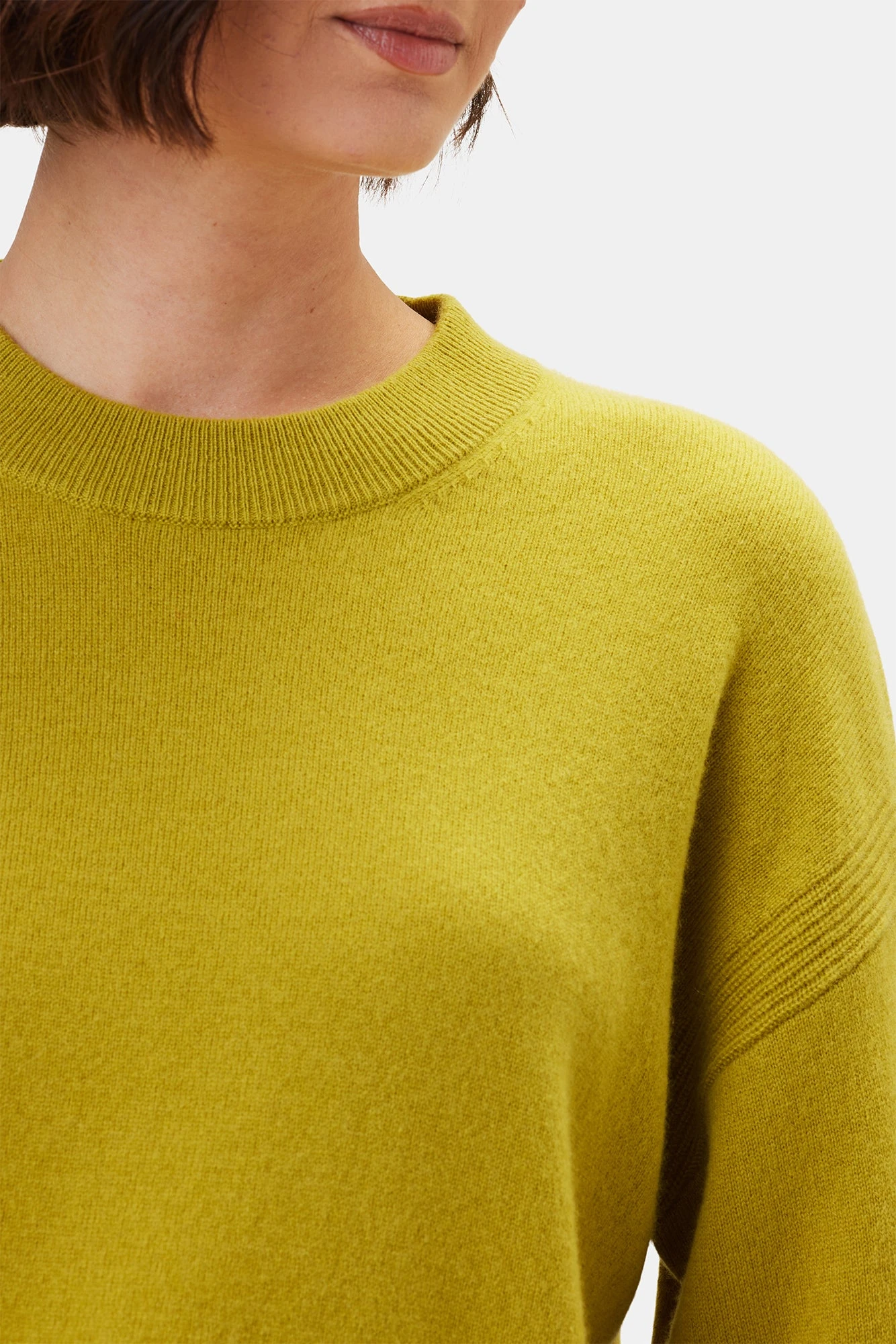 - Mid-gauge cashmere sweater featuring crewneck, long sleeve, drop shoulder and rib detailing around shoulder.