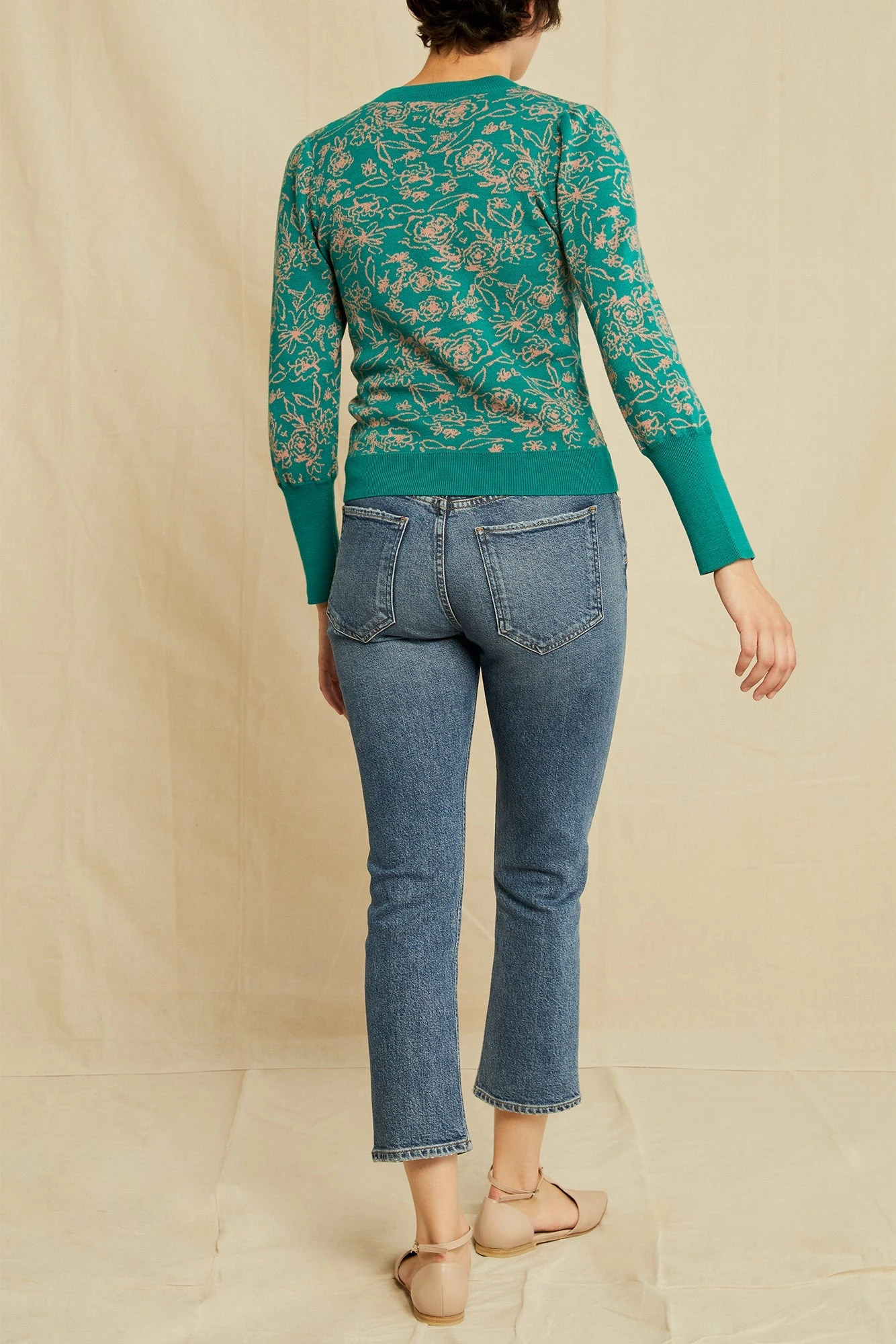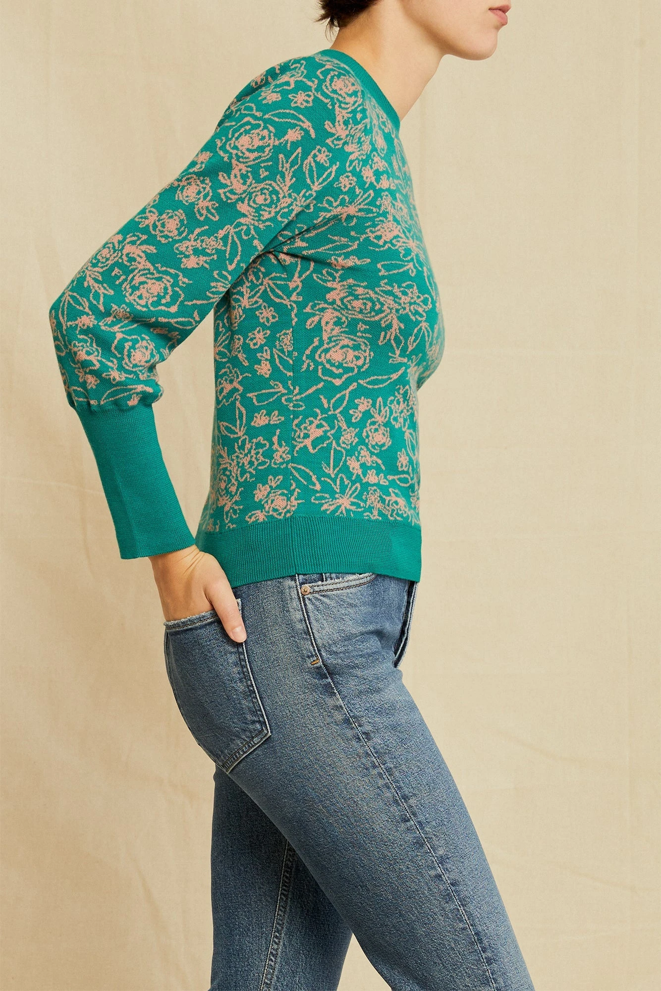 - Floral jacquard crew neck style