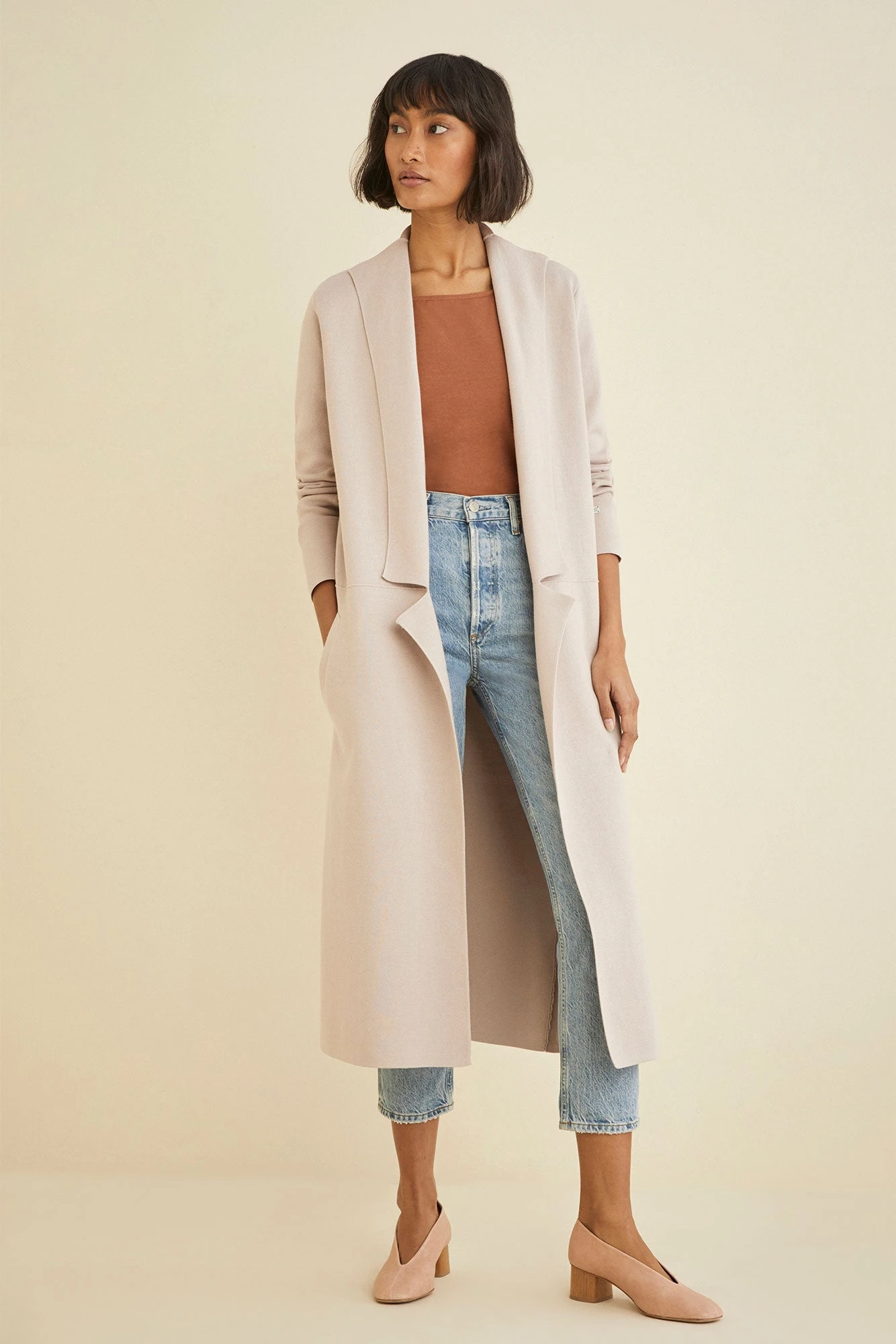 Long open front coatigan with side pockets, a modern lapel, and straight fit. This easy layering piece doubles as a cardigan and a coat.