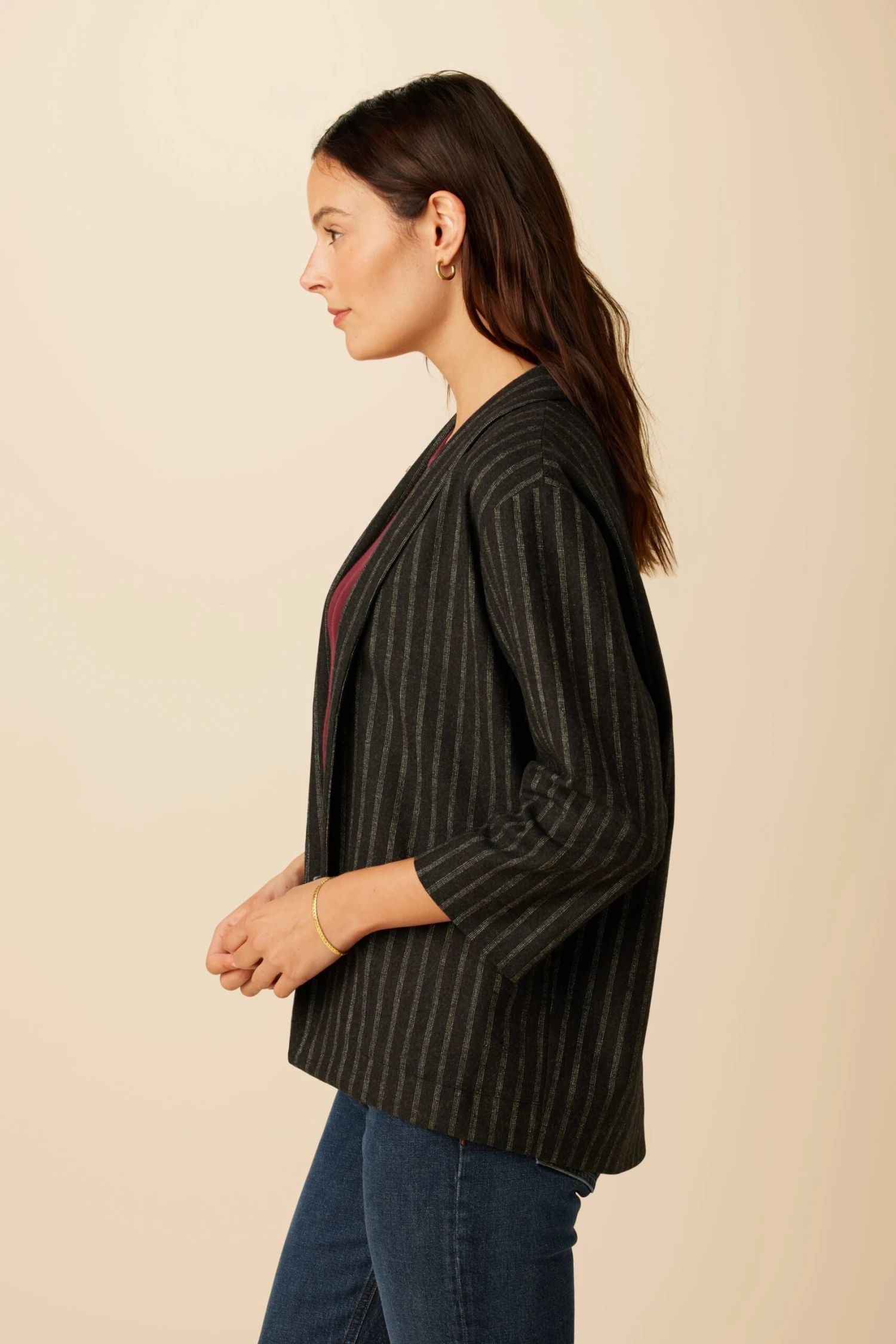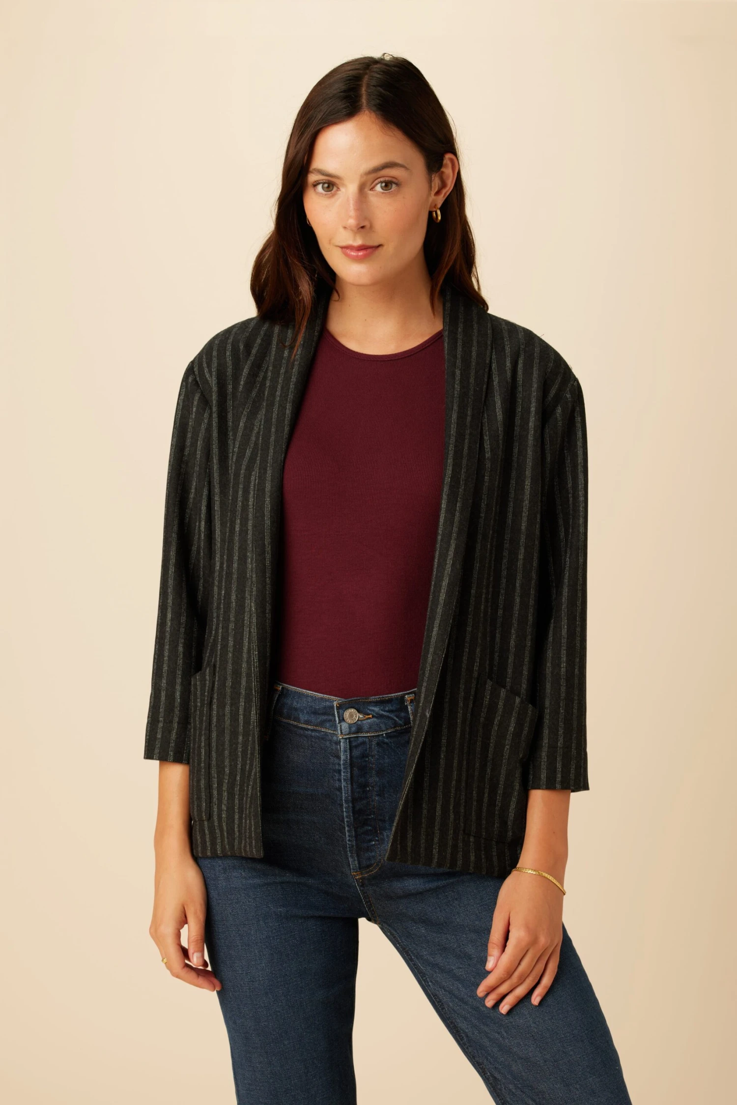 Our take on a classic blazer, this open front, boxy jacket features a drop shoulder, shawl collar and side pockets. Made from an upcycled blend of wool and fully lined, this jacket is perfect paired with your favorite denim and tee for an easy upgraded look