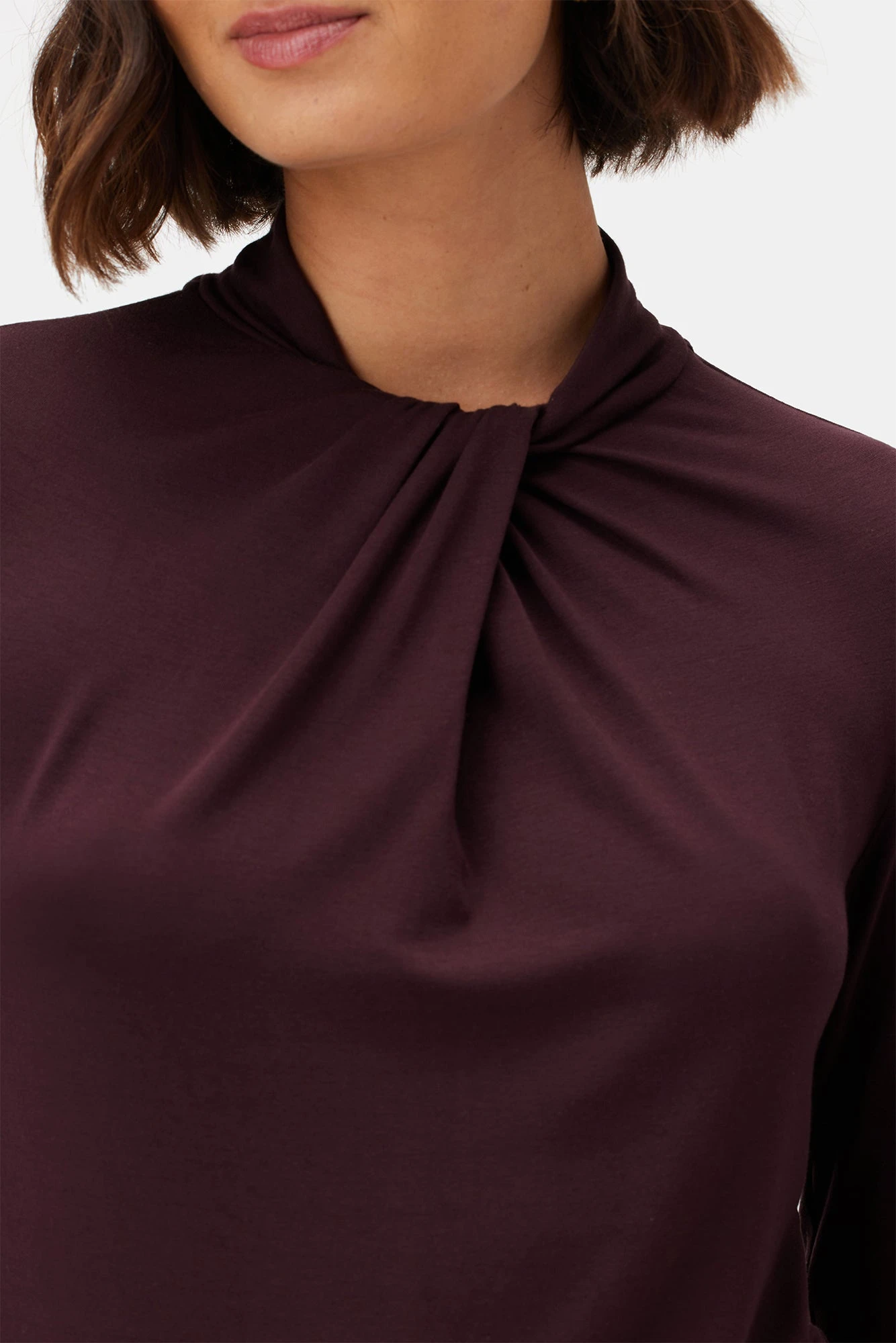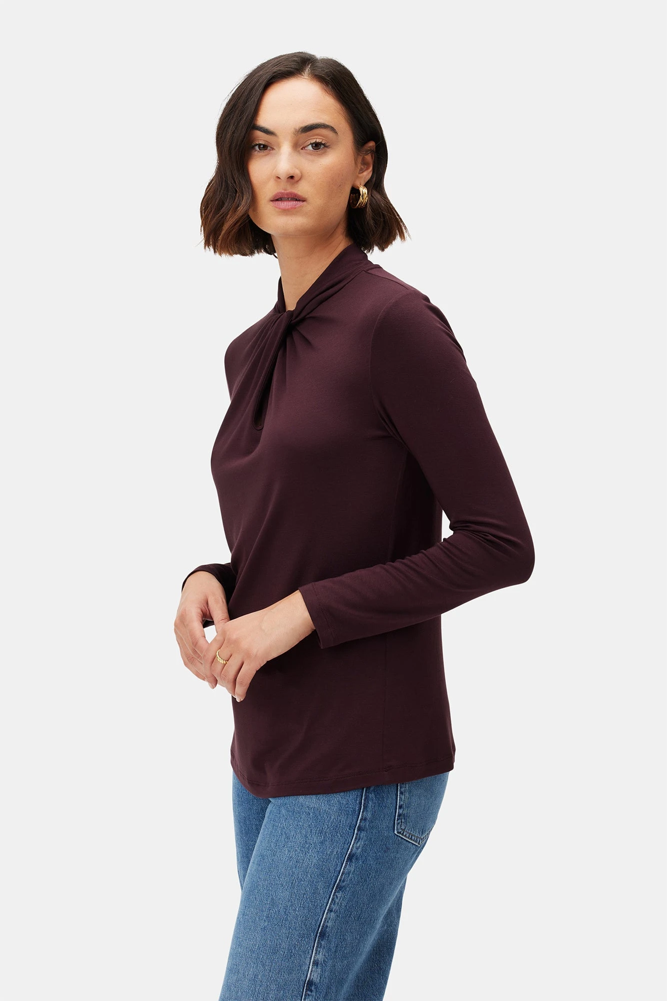 - Long sleeve, slim fit top featuring mock neck twist detail and center front slit, with loop and button closure at back neck.