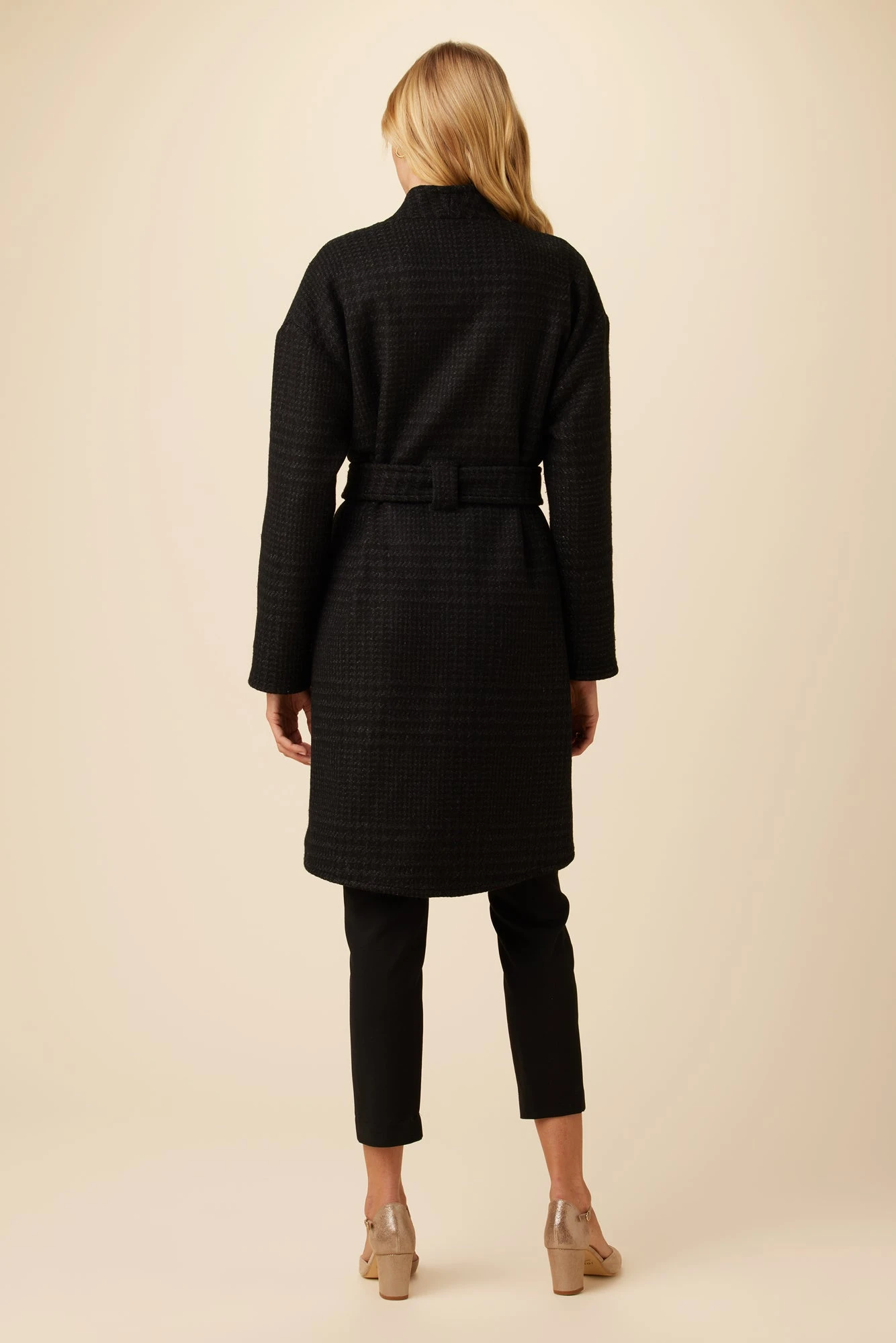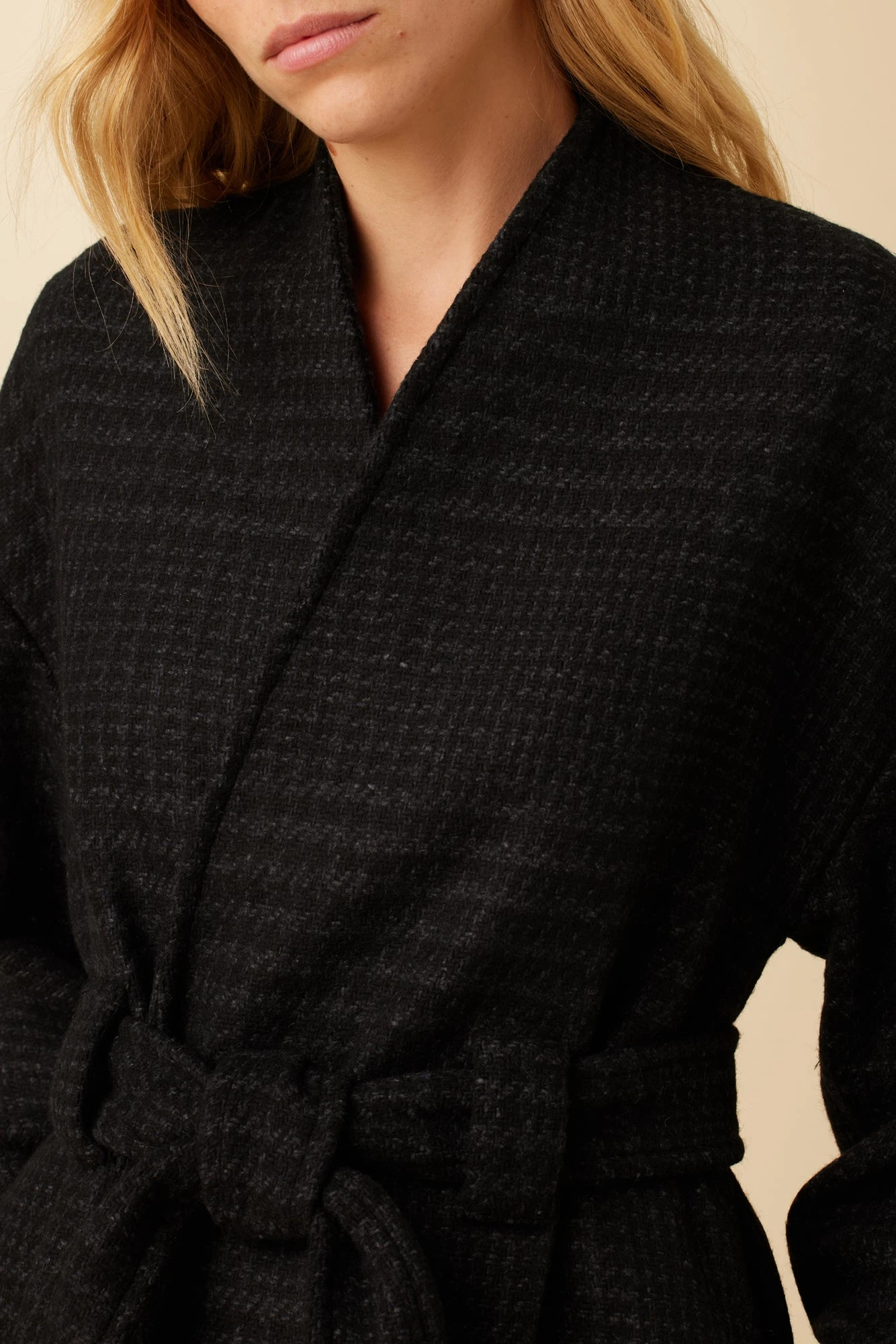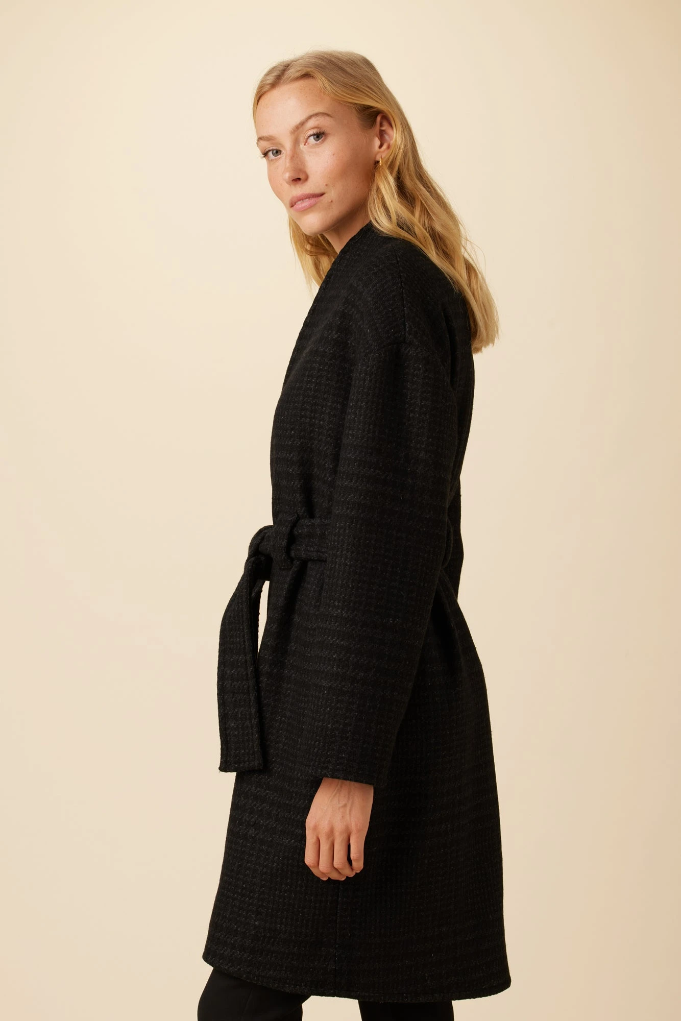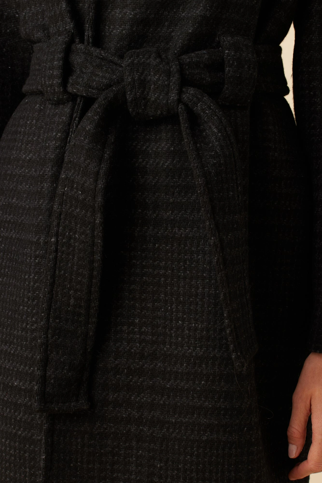 Fully lined long sleeve wrap coat featuring a drop shoulder, shawl collar and detachable tie, made from an upcycled wool blend.